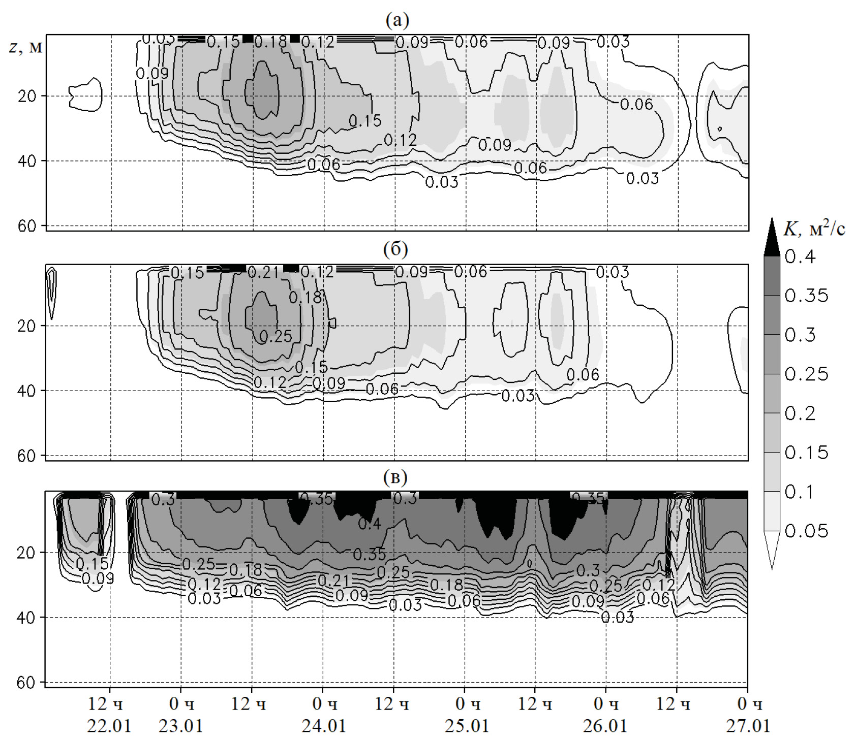 Как видно из рис. 6а, б, в основном расчете и эксперименте 1 распределения K различаются незначительно. В 12 ч 23 января скорость ветра в рассматриваемой точке достигла наибольшего значения за время вторжения и коэффициент турбулентной вязкости также достиг максимального значения в середине ВКС. В эксперименте 2 (рис. 6в) перемешивание сосредоточено в верхней половине ВКС, где коэффициент обмена достигает максимальных значений.