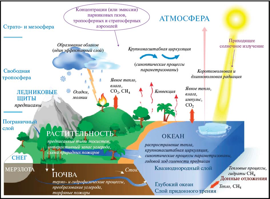 Как и другие современные модели Земной климатической системы, МЗС ИФА РАН состоит из блоков динамики атмосферы, океана, морского льда, деятельного слоя суши, биогеохимических циклов суши и океана и блока описания электрических процессов в атмосфере (молниевой активности, рис. 1).