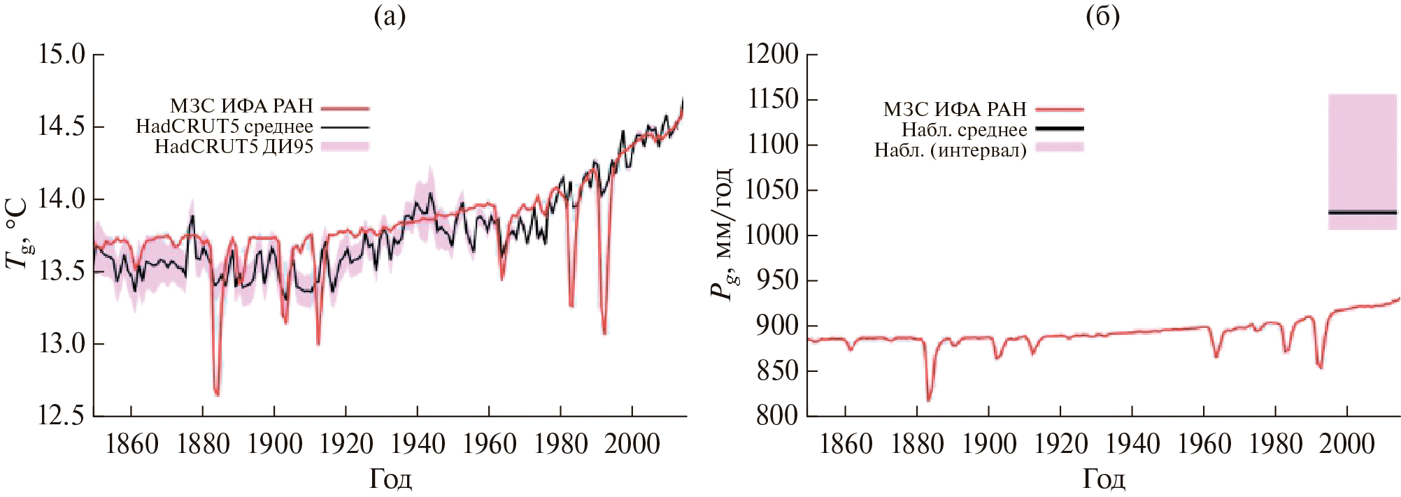 Рис. 2. Средняя глобальная температура у поверхности Tg по расчетам с МЗС ИФА РАН в сравнении с данными HadCRUT5 (а) и глобальных годовых осадков Pg (б) в сравнении с данными табл. 8.1 из [Climate Change, 2021]