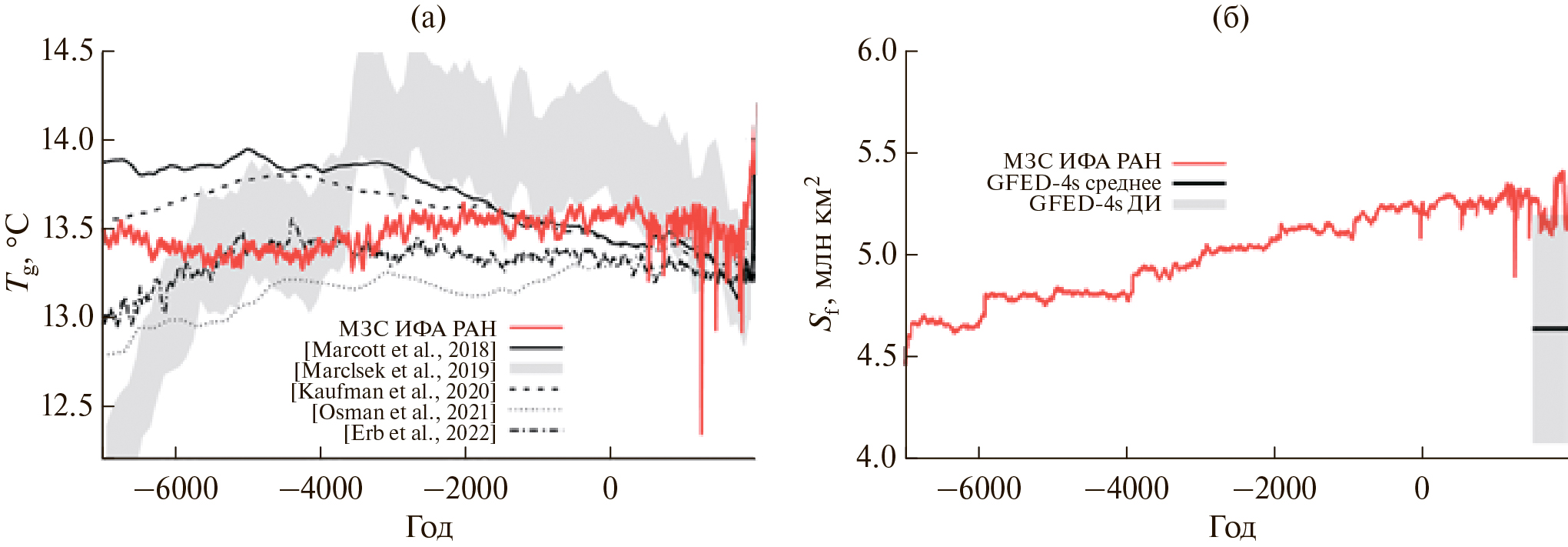 Рис. 4. Средняя глобальная температура приповерхностного воздуха Tg в голоцене (а) и площади выгорания из-за природных пожаров (б) по расчётам с МЗС ИФА РАН