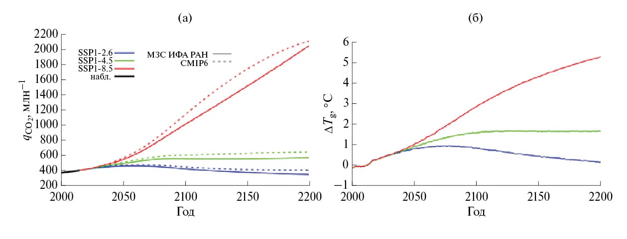 Рис. 6. Концентрация CO2 в атмосфере (а) и изменение средней глобальной температуры приповерхностного воздуха относительно 2000–2015 гг. (б) при сценариях SSP