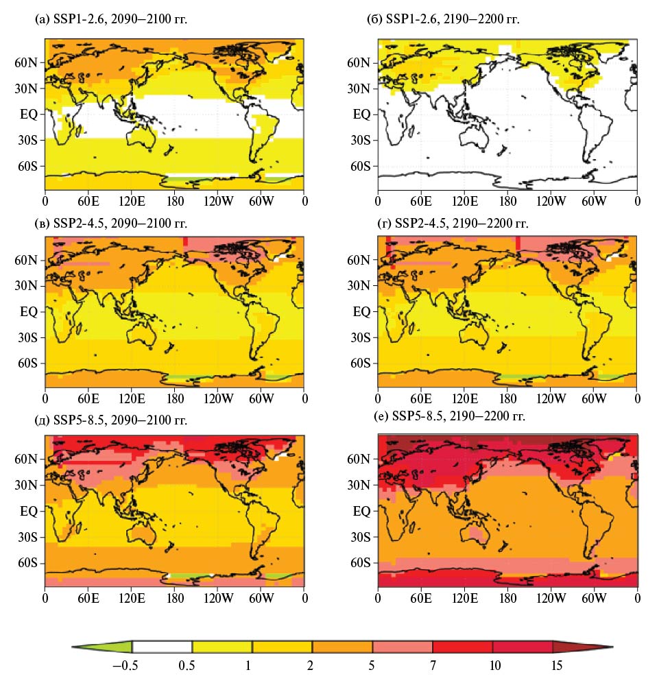 Рис. 7. Изменение приповерхностной температуры Т в расчетах с МЗС ИФА РАН при сценариях SSP1-2.6 (а и б), SSP2-4.5 (в и г) и SSP5-8.5 (д и е) в 2090–2100 гг. (а, в, д) и в 2190–2200 гг. (б, г, е) относительно среднего за 2000–2015 гг.