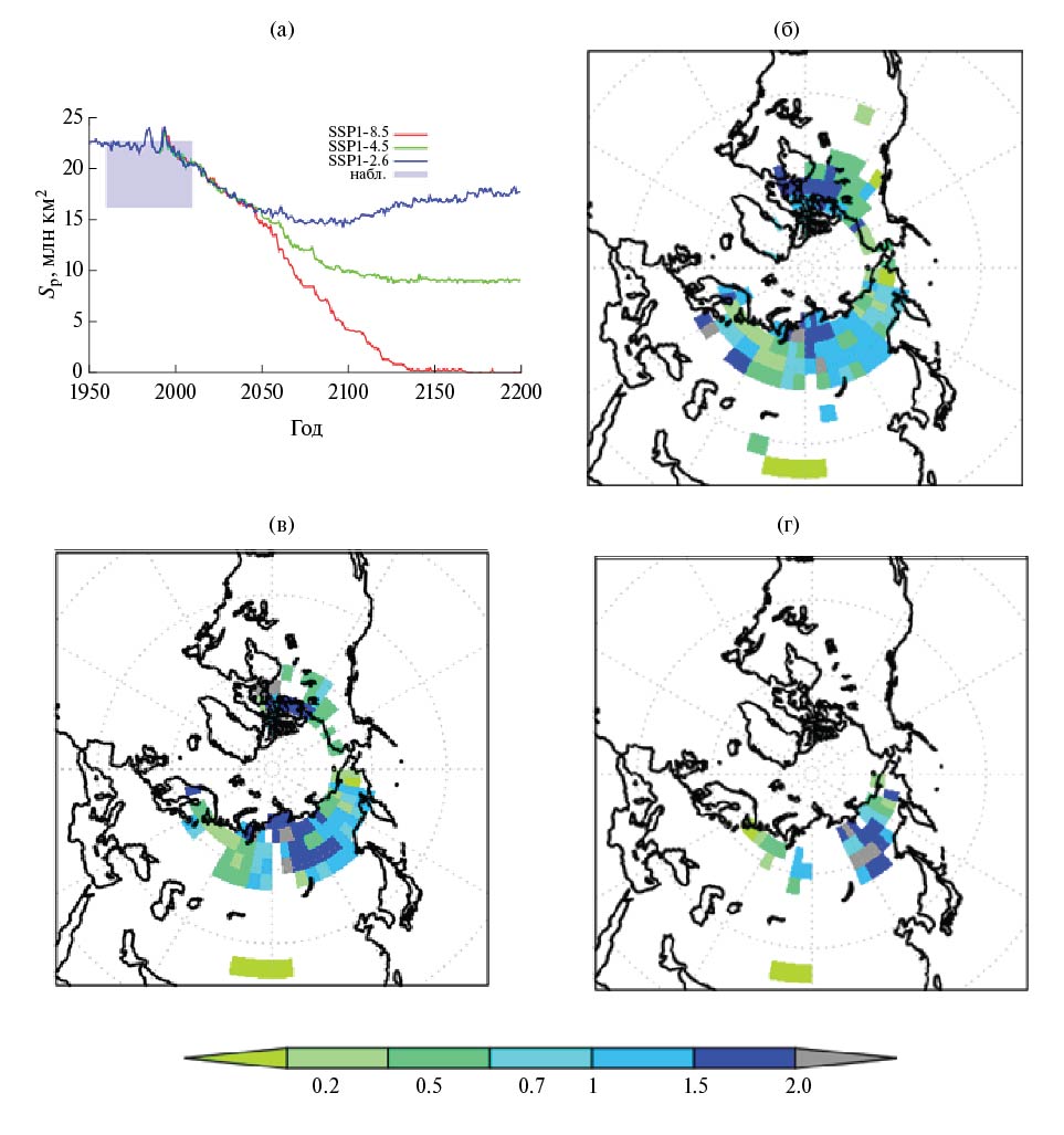 Площадь распространения приповерхностного многолетнемерзлого грунта (ПММГ) Sp в модели в XX–начале XXI вв. составляет 16–22 млн км2 [Аржанов и др., 2008; Елисеев и др., 2009; Аржанов и др., 2010; Аржанов и др., 2013], что согласуется с современными эмпирическими оценками (рис. 10а). В расчетах при сценариях SSP (см. раздел 3.3) к 2100 г. потепление климата приводит к сокращению этой площади до 5–15 млн км2 в зависимости от сценария. В XXI в. при всех сценариях происходит полная деградация ПММГ в Европе (включая европейскую часть России), а в Сибири и в Северной Америке глубина сезонного протаивания увеличивается на несколько десятков сантиметров (рис. 10б–г). Это находится в пределах интервала, полученного для других климатических моделей при сценариях семейства RCP [Koven et al., 2013]. При сценарии SSP1-2.6 минимальное значение Sp, равное 14 млн км2, достигается к концу XXI в., а затем увеличивается, достигая 18 млн км2 к концу XXII столетия. При сценарии SSP2-4.5 в начале XXII в. площадь распространения ПММГ стабилизируется на значении 9 млн км2, тогда как при сценарии SSP5-8.5 к середине XXII в. приповерхностные многолетнемерзлые почвогрунты деградируют практически полностью. Во всех случаях отклик площади распространения ПММГ запаздывает относительно изменений глобальной температуры на несколько десятилетий.