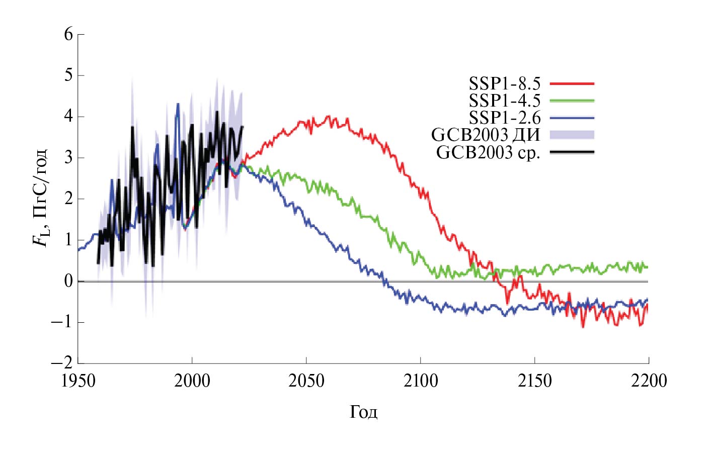 В этих численных экспериментах qCO2 в 2017 г. достигает 407 млн–1 (рис. 6а) в согласии с данными наблюдений [Le Quèrè et al., 2018]. По расчетам с МЗС ИФА РАН в 2050 г. qCO2 вырастет относительно 2017 г. на 15–136 млн–1 в зависимости от сценария. К 2100 г. концентрация CO2 в атмосфере в 2100 г. в зависимости от сценария будет либо меньше (на 37 млн–1 при сценарии SSP1-2.6), либо больше (на 49 млн–1 при сценарии SSP2-4.5 и на 600 млн–1 при сценарии SSP5-8.5), чем в 2017 г. Содержание СО2 в атмосфере в расчетах с моделью меньше, чем в исходных сценариях SSP, подготовленных CMIP6. В XXII столетии при сценарии SSP2-4.5 qCO2 практически стабилизируется (возрастая лишь на 13 млн–1), при сценарии SSP2-4.5, уменьшается до 347 млн–1 при сценарии SSP1-2.6 и достигает 2048 млн–1 при сценарии SSP5-8.5
