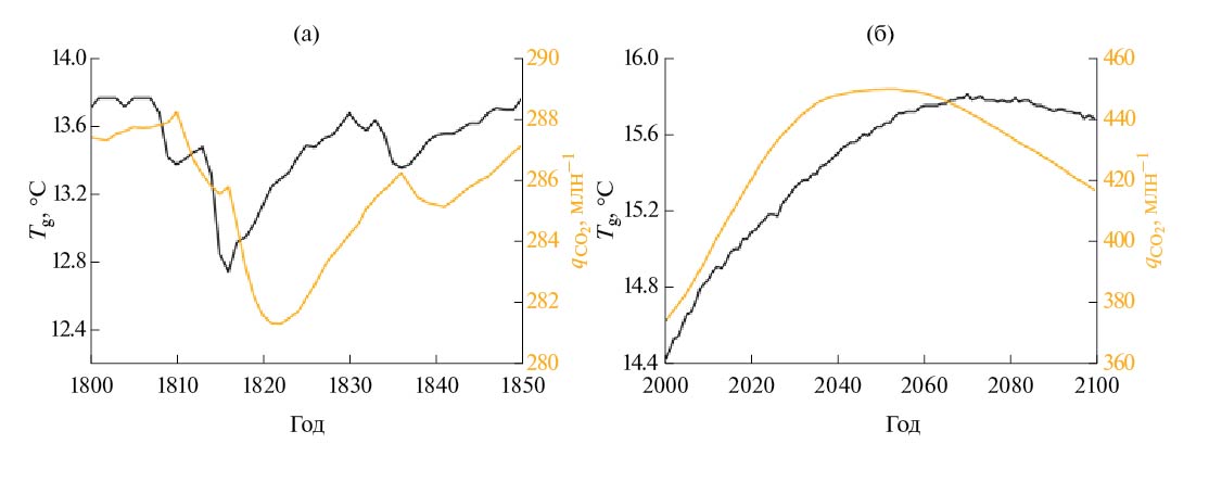 Для доиндустриального периода значение Tg в модели равно 13.5°С (рис. 2а), что близко к эмпирической оценке 13.4°С по данным HadCRUT5 [Morice et al., 2021]. Глобальная интенсивность осадков в модели составляет 885 мм/год (рис. 2б) – несколько ниже эмпирической оценки 1126 мм/год (с интервалом неопределенности от 1007 до 1157 мм/год) по данным табл. 8.1 из [Climate Change, 2021] для 1991–2010 гг. Подобные и даже бóльшие погрешности характерны и для современных моделей Земной климатической системы, основанных на моделях общей циркуляции [Liu et al., 2014].