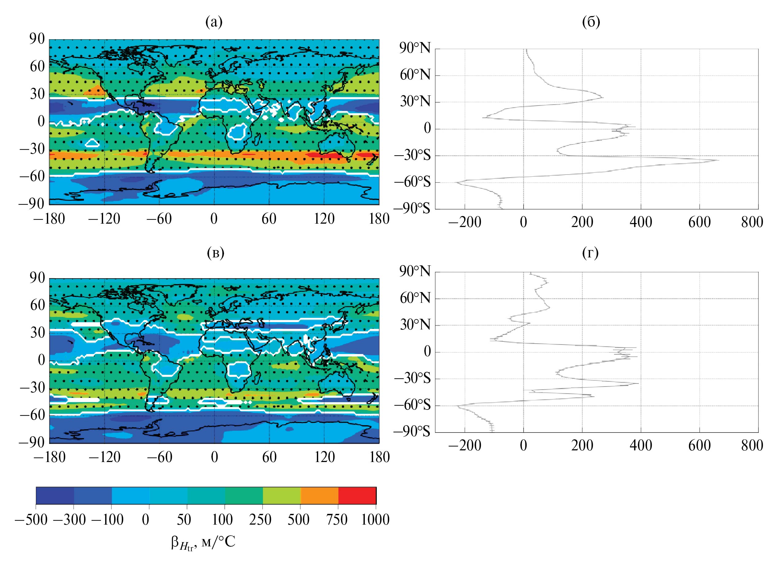 Рис. 6. Подобно рис. 5, но для параметра βHtr связи высоты тропопаузы с приповерхностной температурой