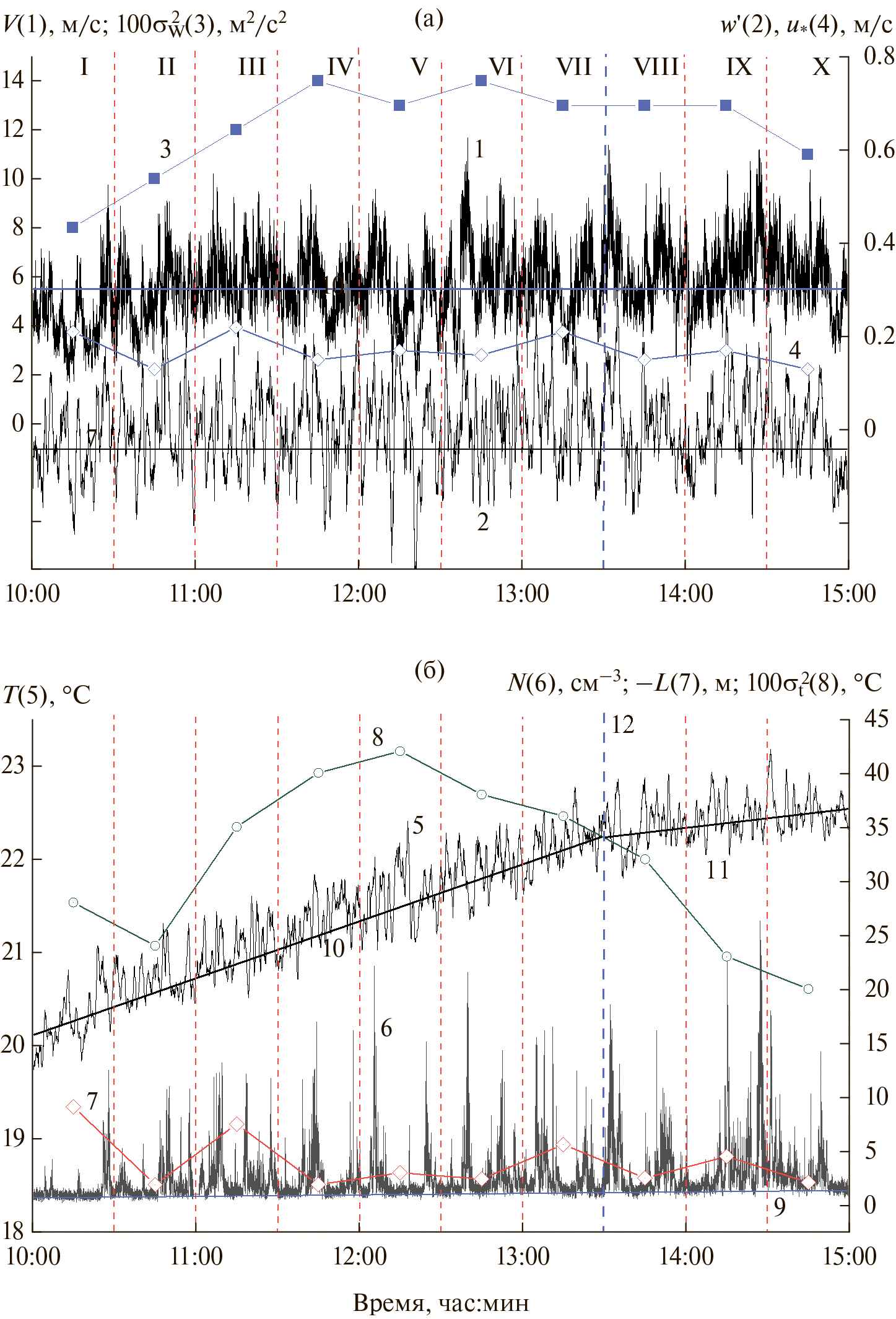 На рис. 1 показаны результаты синхронных измерений 09.09.2021 в приземном слое атмосферы в конвективных условиях на опустыненной территории вблизи р. Волга в Астраханской обл. горизонтальной (1) и вертикальной (2) компонент скорости ветра, температуры воздуха (5) и концентрации частиц аэрозоля (6) на высоте 3 м. Флуктуации вертикальной компоненты скорости ветра и температуры воздуха сглажены на скользящем интервале 1 мин. На временном ходе горизонтальной компоненты скорости ветра отчетливо проявляется ее конвективно обусловленная низкочастотная изменчивость (рис. 1а). Красной прямой линией показана пороговая скорость сальтации V0 = 5.5 м/с, которая близка к средней скорости ветра = 5.7 м/с в рассматриваемый нами период времени. Благодаря нелинейной связи интенсивности сальтации со скоростью ветра низкочастотная изменчивость на концентрации частиц пылевого аэрозоля выражена сильнее, чем на горизонтальной компоненте скорости ветра. Всплесковой режим эмиссии позволил оценить и учесть вклад в среднем медленно меняющейся концентрации частиц фонового аэрозоля (9 на рис. 1б).