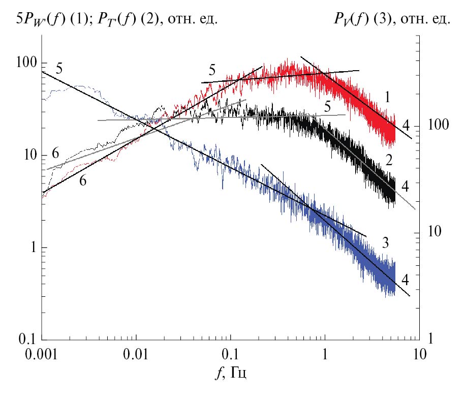 Низкочастотная часть спектров Pw(f) и PT(f) (6 на рис. 3б) аппроксимирована степенными спектрами в области f < 0.1 Гц с показателями –0.57 и –0.62, что свидетельствует о сравнительно быстром снижении мощности флуктуаций с уменьшением частоты. В промежуточной области, которая включает сравнительно небольшой диапазон частот между f1 и f2 аппроксимирующие спектры Pw(f) и PT(f) слабо зависят от частоты (K3 = –0.2 и –0.05).