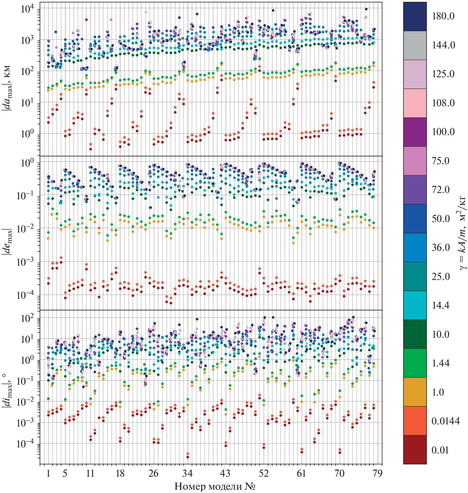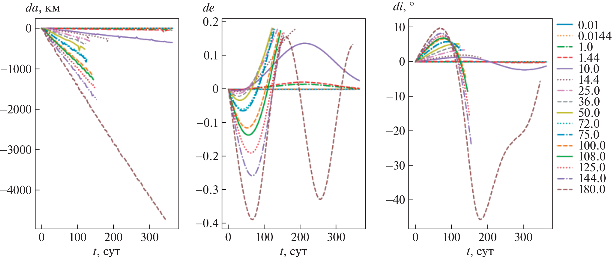 This study is devoted to assessing the effect of light pressure on the observed position and orbital elements of space debris objects with a large area-to-mass ratio \(A{\text{/}}m\) in the region of medium-high, geostationary and highly elliptical orbits over short time intervals (up to 1 year). Numerical integration of the orbits of 78 model objects was performed at 8 values of \(A{\text{/}}m\) from \(0.01\) to \(125\) m2/kg and two values of the reflection coefficient \(k = 1.0\) and 1.44. The maximum (during the given time periods) angular distances relative to the sub-satellite point on the Earth’s surface between the positions found with and without radiation forces, as well as the maximum changes in the semi-major axis, eccentricity and inclination of the orbit under the influence of radiation forces during the integration time, are determined. It is found that for all objects there is a negative drift of the semi-major axis. For models with semi-major axes of 10 000, 15 000, and 20 000km, the inclination variations do not exceed \(15^\circ \). Among other objects, at \(\gamma = kA{\text{/}}m \geqslant 50\) m2/kg, cases of transitions from direct to reverse motion (and vice versa) due to light pressure, were recorded, which indicates the possibility of flips of the orbital plane under the influence of radiation forces even in the short term. The duration of successful integration (the lifetime of an object in orbit) is given; it was less than \(1\) year for most models with \(\gamma \geqslant 50.0\) m2/kg. Also the time intervals during which the displacement of the position perturbed under the influence of radiation forces from the unperturbed one does not exceed \(5\prime \), \(45\prime \), and \(3^\circ \) are presented, depending on the value of \(\gamma \), semi-major axis, and eccentricity in the initial epoch. Based on the results of the article, it is possible to estimate the required frequency of observations of objects with large \(A{\text{/}}m\).