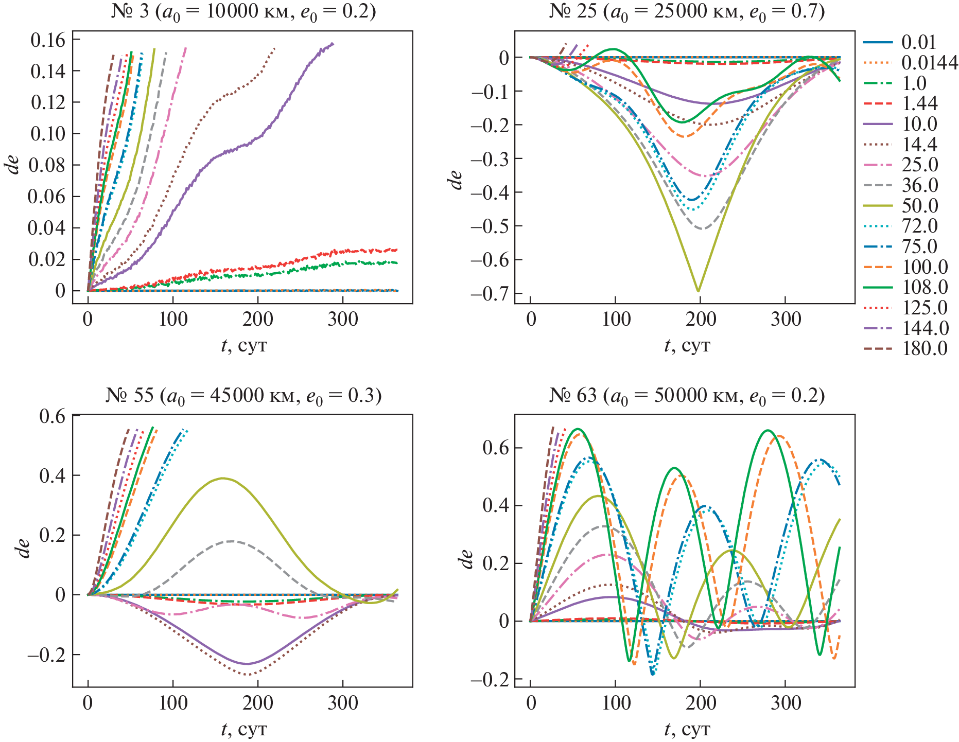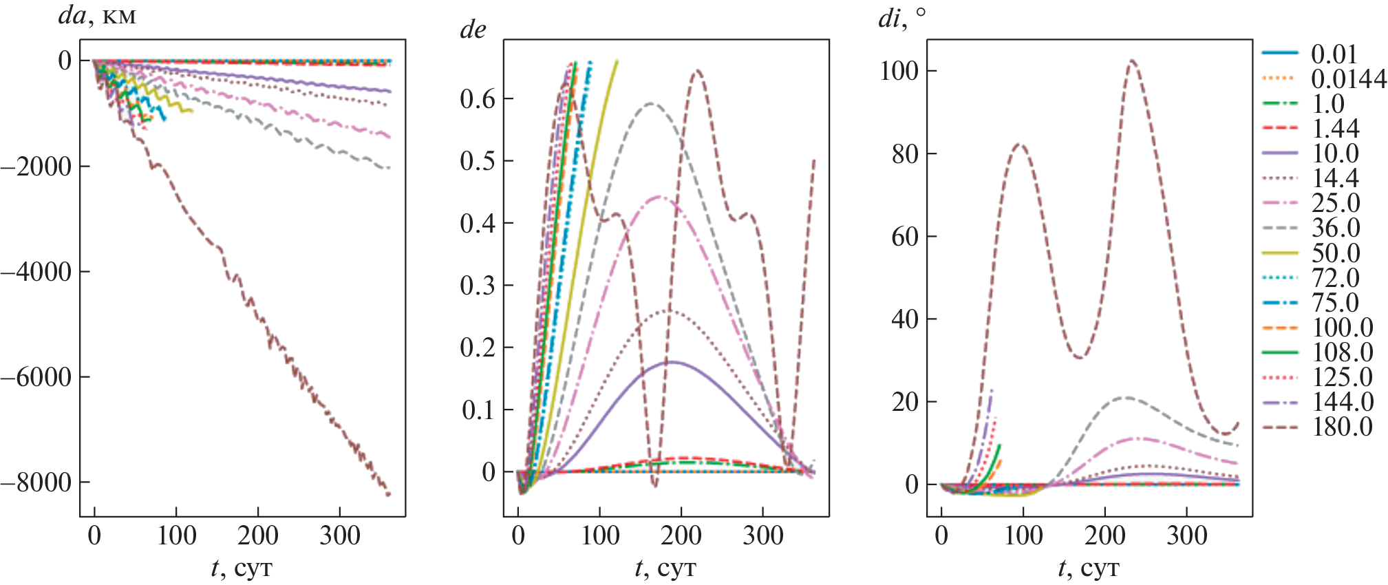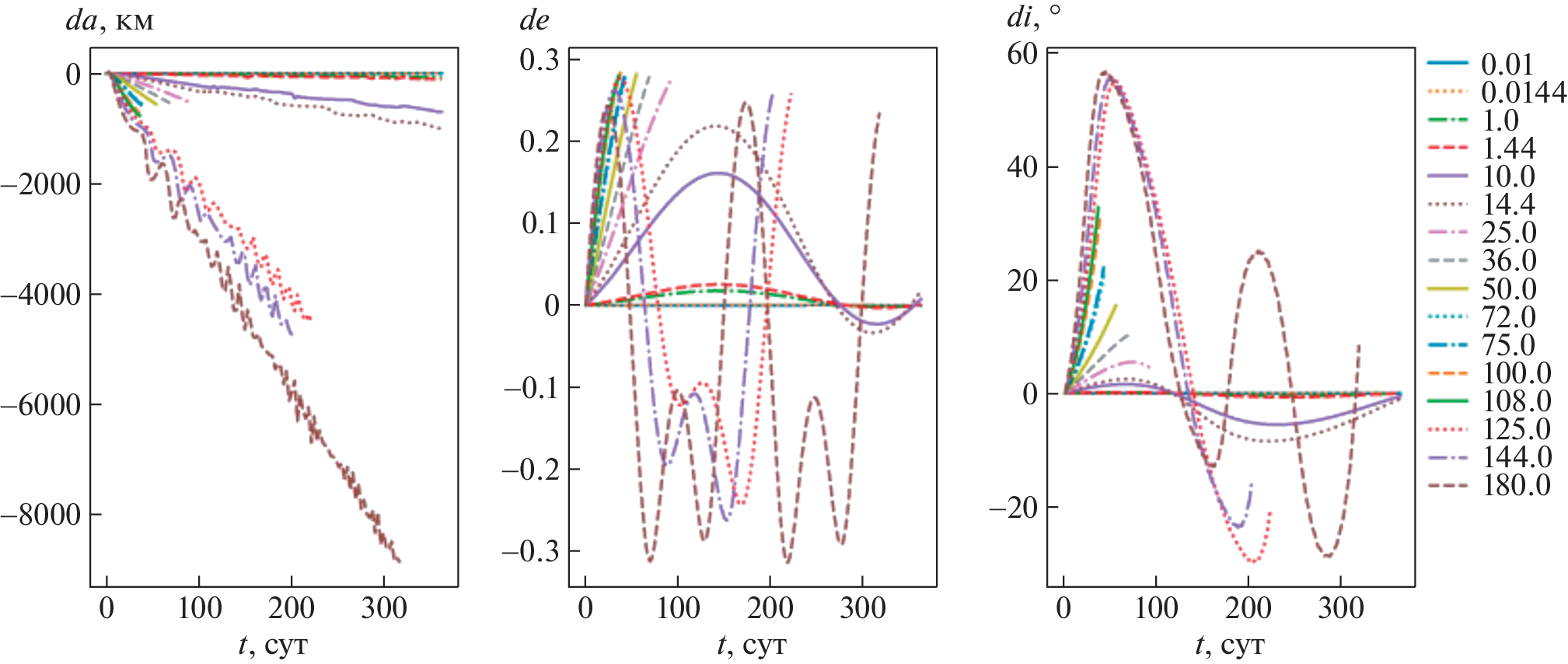 This study is devoted to assessing the effect of light pressure on the observed position and orbital elements of space debris objects with a large area-to-mass ratio \(A{\text{/}}m\) in the region of medium-high, geostationary and highly elliptical orbits over short time intervals (up to 1 year). Numerical integration of the orbits of 78 model objects was performed at 8 values of \(A{\text{/}}m\) from \(0.01\) to \(125\) m2/kg and two values of the reflection coefficient \(k = 1.0\) and 1.44. The maximum (during the given time periods) angular distances relative to the sub-satellite point on the Earth’s surface between the positions found with and without radiation forces, as well as the maximum changes in the semi-major axis, eccentricity and inclination of the orbit under the influence of radiation forces during the integration time, are determined. It is found that for all objects there is a negative drift of the semi-major axis. For models with semi-major axes of 10 000, 15 000, and 20 000km, the inclination variations do not exceed \(15^\circ \). Among other objects, at \(\gamma = kA{\text{/}}m \geqslant 50\) m2/kg, cases of transitions from direct to reverse motion (and vice versa) due to light pressure, were recorded, which indicates the possibility of flips of the orbital plane under the influence of radiation forces even in the short term. The duration of successful integration (the lifetime of an object in orbit) is given; it was less than \(1\) year for most models with \(\gamma \geqslant 50.0\) m2/kg. Also the time intervals during which the displacement of the position perturbed under the influence of radiation forces from the unperturbed one does not exceed \(5\prime \), \(45\prime \), and \(3^\circ \) are presented, depending on the value of \(\gamma \), semi-major axis, and eccentricity in the initial epoch. Based on the results of the article, it is possible to estimate the required frequency of observations of objects with large \(A{\text{/}}m\).