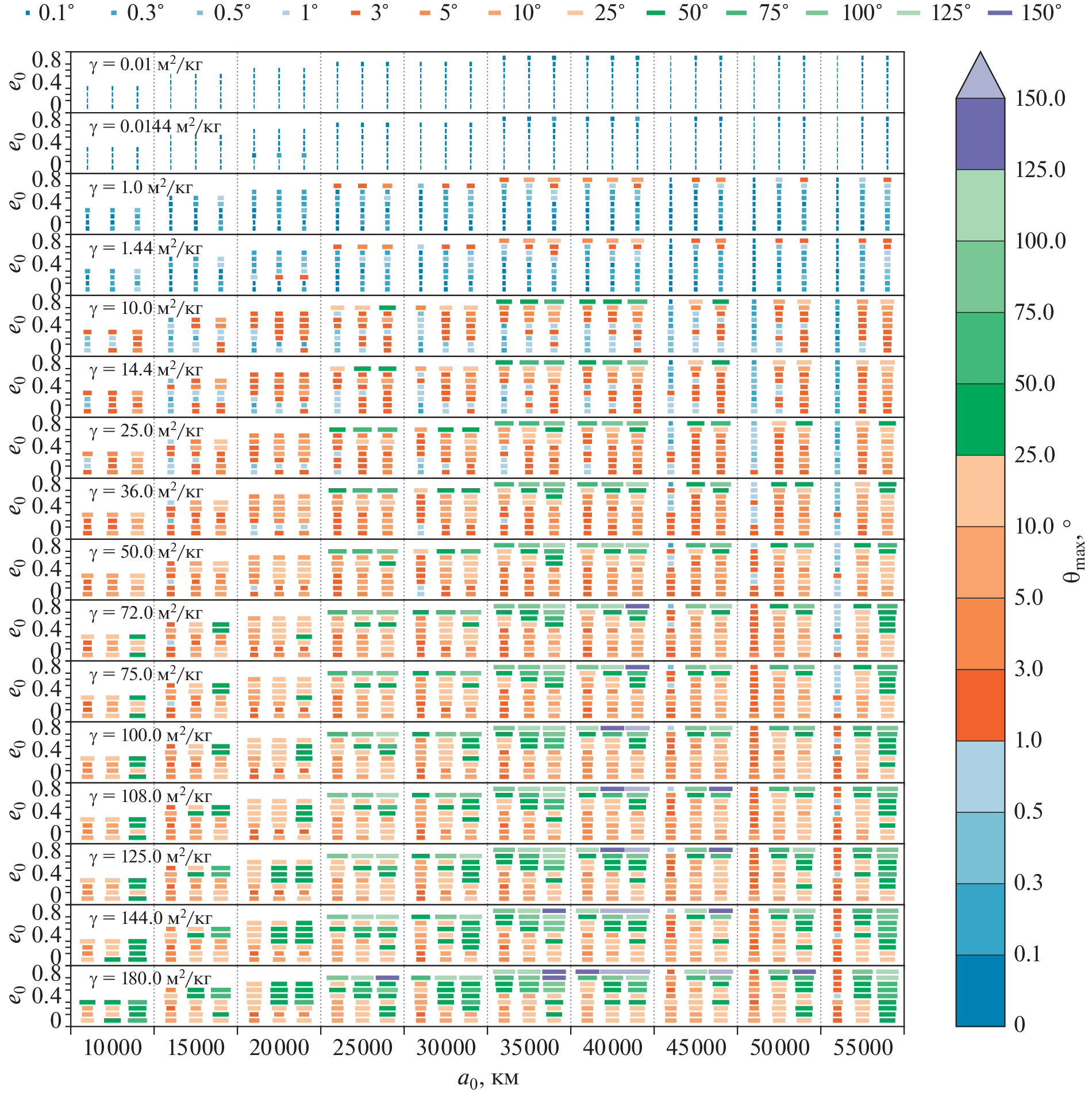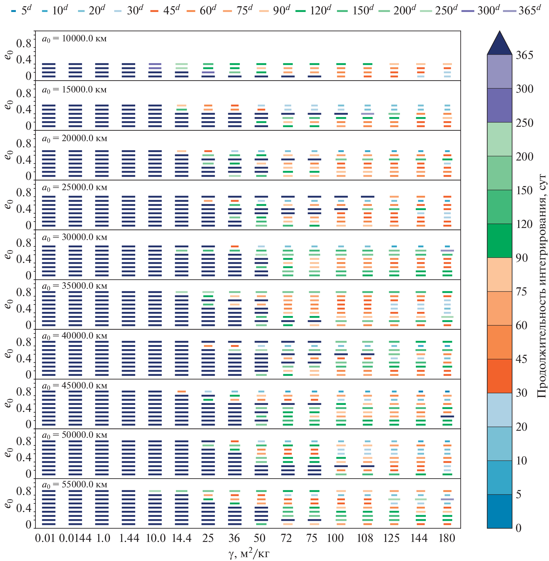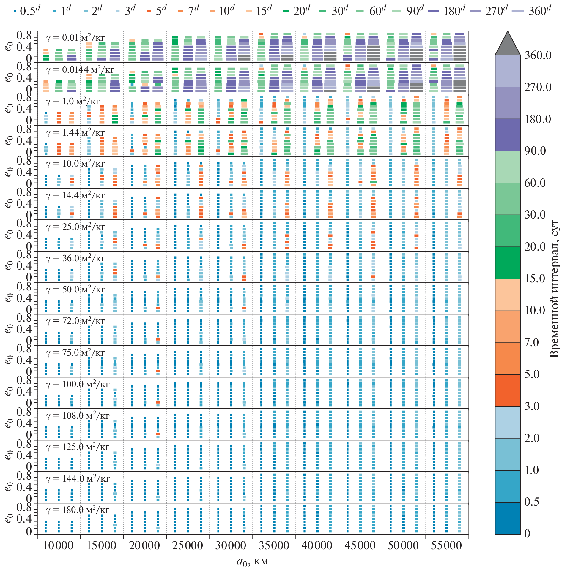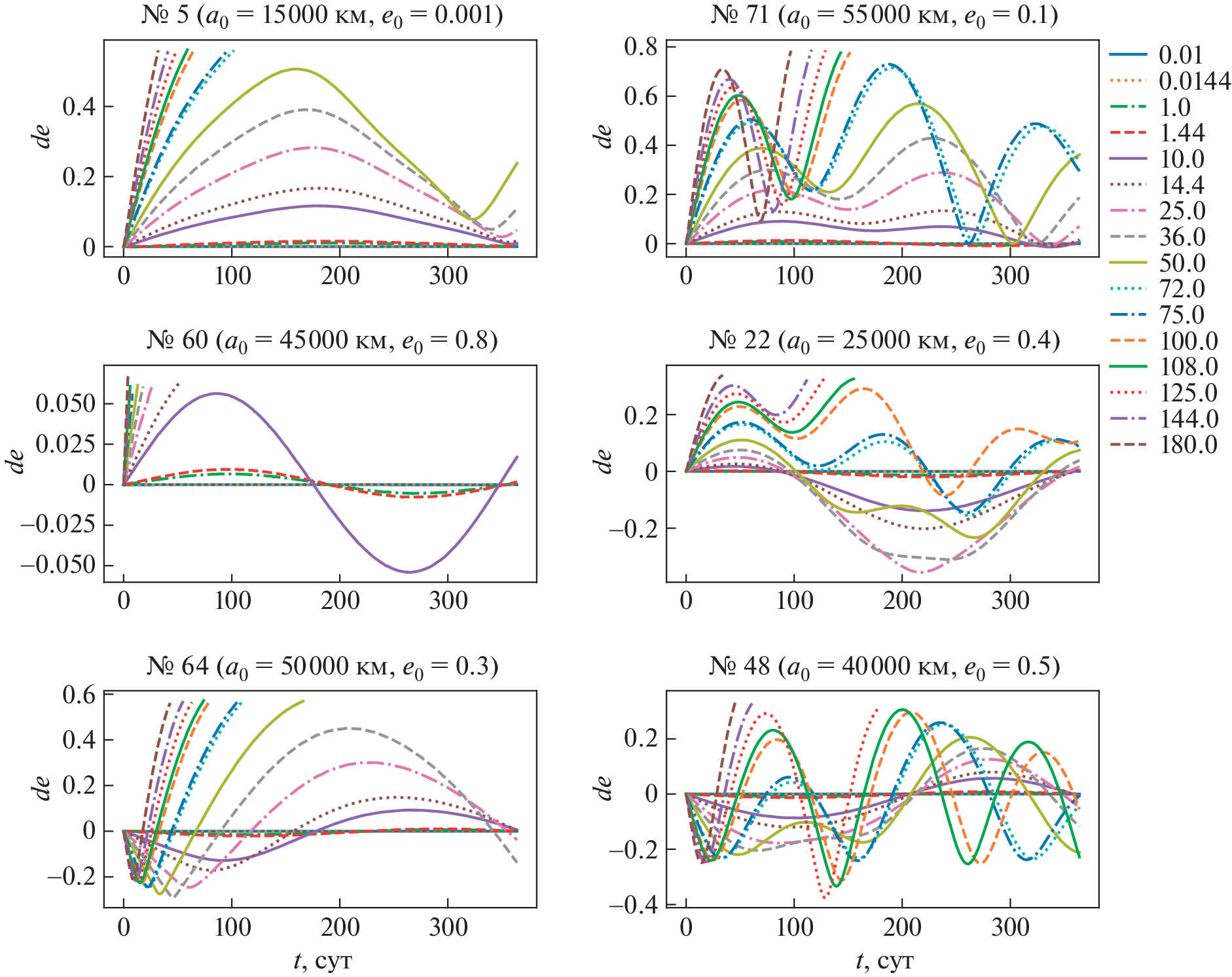 This study is devoted to assessing the effect of light pressure on the observed position and orbital elements of space debris objects with a large area-to-mass ratio \(A{\text{/}}m\) in the region of medium-high, geostationary and highly elliptical orbits over short time intervals (up to 1 year). Numerical integration of the orbits of 78 model objects was performed at 8 values of \(A{\text{/}}m\) from \(0.01\) to \(125\) m2/kg and two values of the reflection coefficient \(k = 1.0\) and 1.44. The maximum (during the given time periods) angular distances relative to the sub-satellite point on the Earth’s surface between the positions found with and without radiation forces, as well as the maximum changes in the semi-major axis, eccentricity and inclination of the orbit under the influence of radiation forces during the integration time, are determined. It is found that for all objects there is a negative drift of the semi-major axis. For models with semi-major axes of 10 000, 15 000, and 20 000km, the inclination variations do not exceed \(15^\circ \). Among other objects, at \(\gamma = kA{\text{/}}m \geqslant 50\) m2/kg, cases of transitions from direct to reverse motion (and vice versa) due to light pressure, were recorded, which indicates the possibility of flips of the orbital plane under the influence of radiation forces even in the short term. The duration of successful integration (the lifetime of an object in orbit) is given; it was less than \(1\) year for most models with \(\gamma \geqslant 50.0\) m2/kg. Also the time intervals during which the displacement of the position perturbed under the influence of radiation forces from the unperturbed one does not exceed \(5\prime \), \(45\prime \), and \(3^\circ \) are presented, depending on the value of \(\gamma \), semi-major axis, and eccentricity in the initial epoch. Based on the results of the article, it is possible to estimate the required frequency of observations of objects with large \(A{\text{/}}m\).
