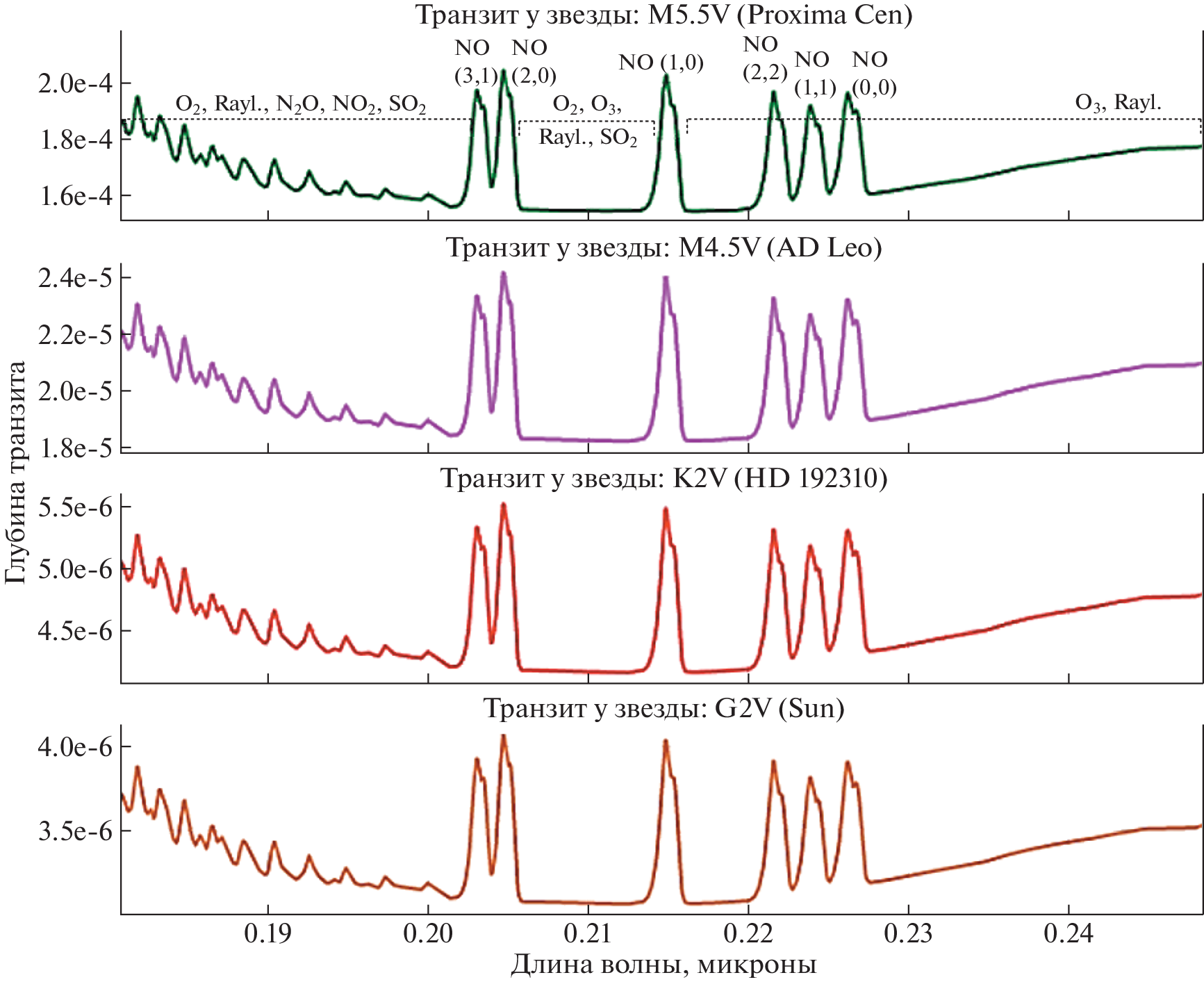 Among all habitability factors for terrestrial exoplanets, one of the most important is the presence of a secondary N2–O2 dominant atmosphere in an exoplanet. This factor can potentially indicate the already existing geological and biological processes on the exoplanet. Meanwhile, direct characterization of the N2–O2 atmospheres of terrestrial exoplanets is a difficult observational task. There are only a few indicators (molecules) of such an atmosphere, among which one can single out a potential biomarker – a molecule of nitric oxide NO. The strongest spectral features of this molecule in the ultraviolet range are γ-bands (203–248 nm). An important role in the search for potential biomarkers on exoplanets, including the registration of NO γ‑bands, can be played by planned for the launch WSO-UV space observatory. In the paper estimates of the possibility of detecting the transmission of light in γ-bands in the atmospheres of exoplanets with this observatory are presented. The methods of emission and transmission spectroscopy are compared as applied to the detection of NO. Based on the results of this work, it is shown that there is a potential possibility of detecting a transmission signal in the NO γ-bands in the atmospheres of nearby exoplanets (<10 pc) using the LSS spectrograph of the WSO-UV observatory. At the same time, the imposed restrictions for the registration of this signal on more distant exoplanets are presented.