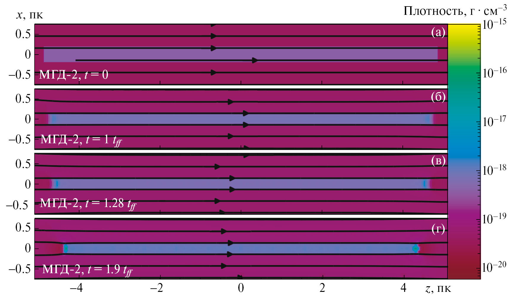 На рис. 3 приведены срезы плотностей в плоскости xɀ для расчета МГД-2 в моменты времени t = 0.1tff , 1.28tff , 1.9tff . В расчете МГД-2 картина коллапса качественно похожа на результаты для варианта МГД-1. Волокно сжимается до радиуса r ≈ 0.3 пк и концентрации n ≈ 2×10⁵ см⁻³к моменту времени 1tff , после чего сжатие останавливается и начинаются осцилляции волокна вдоль радиуса. Плотность образующихся на торцах волокна ядер к моменту времени 1.9tff составляет n ≈ 2×10⁷ см⁻³.