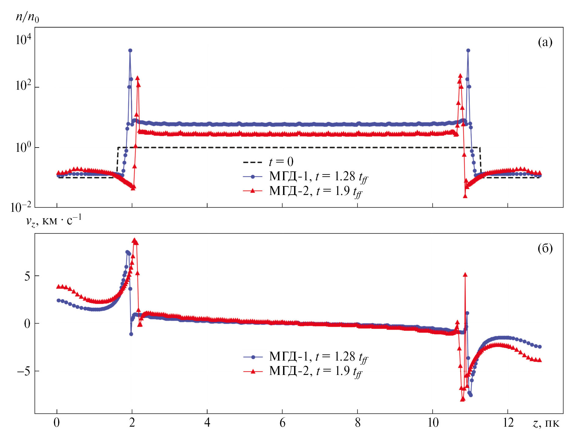 На рис. 4 показана эволюция профилей плотности и скорости вдоль волокна в МГД-расчетах. Расположение торцов волокна в момент времени t = 0 соответствует координатам ɀL = 1.6 пк и ɀR = 11.3 пк. В расчете МГД-1 к моменту времени t = 1.28tff на концах волокна (ɀL = 1.9 пк и ɀR = 11 пк) наблюдаются пики плотностей n = 1.7×10⁸ см⁻³и скоростей vɀ = 3.6 км/с. Пики соответствует ядрам, образующимся на концах волокна. Скорость левого ядра положительна, правого — отрицательна. Для данных значений скоростей число Маха составляет M = 6, то есть ядра двигаются со сверхзвуковыми скоростями навстречу друг к другу.