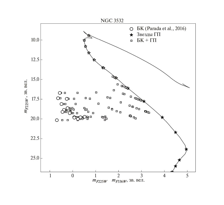 где mБК — звездная величина БК, mГП — звездная величина звезды ГП, а mБК+ГП — звездная величина неразрешенной двойной системы. На рис. 2 показана диаграмма скопления NGC 3532 в фотометрической системе Gaia. Серыми точкам обозначены члены выборки с вероятностью принадлежности к скоплению >50% [32]. Черными звездочками указаны избранные звезды ГП, с которыми комбинировались ассоциированные со скоплением белые карлики, которые, в свою очередь, указаны открытыми кружками. Неразрешенные двойные системы с белыми карликами показаны квадратами. Из рис. 2 видно, что в случае сочетания БК с более горячей звездой ГП двойная система очень мало отличается от звезд главной последовательности.