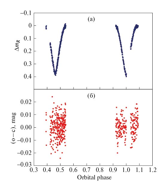 Рис. 2. Дифференциальная кривая блеска на фазах минимумов (a) и невязка (б) между теоретической и наблюдаемой кривыми блеска (o – c ), наблюдения 2021 г. в фильтре Rc, набор параметров системы “b” из табл. 2.