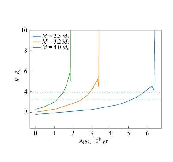 Рис. 4. Зависимость радиуса звезды от ее возраста. Теоретические эволюционные треки для звезд с массами 2.5, 3.2, 4.0 вычислены с использованием формулы (11). Параметры для вычисления радиусов взяты из работы [26]. Пунктирными линиями показаны границы радиуса, соответствующие относительным радиусам звезд из табл. 5 и большой полуоси, вычисленной по третьему закону Кеплера.