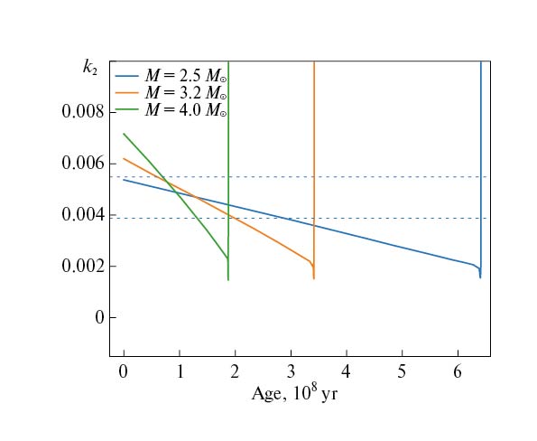 Рис. 5. Зависимость коэффициента k2 от возраста звезды. Показаны теоретические эволюционные треки для звезд с массами 2.5, 3.2, 4.0 [26]. Пунктирными линиями показаны границы параметра k2, найденные из наших наблюдений.