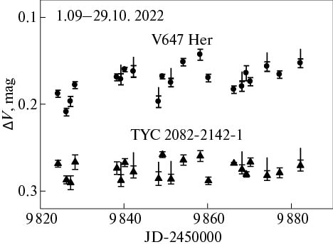 Поведение блеска V647 Her по результатам фотометрии в июле-ноябре 2022 г. представлено в инструментальных величинах на рис. 2а. После первичной обработки из ряда данных (N = 609) были исключены 8 значений, относящихся к вспышке (JD 2459789) и случайным отклонениям, и определены средние значения в даты наблюдений (N = 47). Для сравнения с результатами 2019 г., опубликованными в [12], получен ряд оценок блеска относительно блеска звезды сравнения (рис. 2б). Характер переменности блеска звезды в 2022 г. такой же, как в 2019 г., на обеих кривых блеска сохраняется уровень максимального блеска, но в отдельные эпохи максимальные и минимальные значения не достигаются.