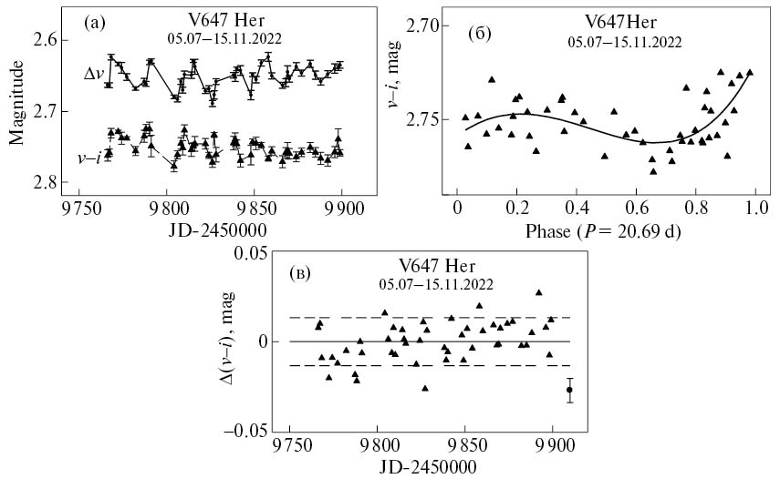 Наблюдаемые особенности переменности блеска V647 Her - малая амплитуда, изменение формы кривой - являются характерными для красных карликов, на поверхности которых присутствуют холодные пятна. Наличие таких пятен приводит к покраснению звезды, что хорошо заметно по показателям цвета в красной области спектра. На рис. 4a приведены изменения блеска и показатели цвета V-I по наблюдениям V647 Her в 2022 г. Показатели цвета меняются в пределах 2.7-2.75, при этом в минимумах блеска звезда становится более красной. Свертка значений V-I с периодом 20.69 сут показана на рис. 4б. Амплитуда переменности составляет ~0m.04, фаза минимума 0.70. После вычитания вклада переменности с периодом 20.69 сут получен ряд остатков, в котором не выявлено изменений, превышающих 2σ (рис. 4в).