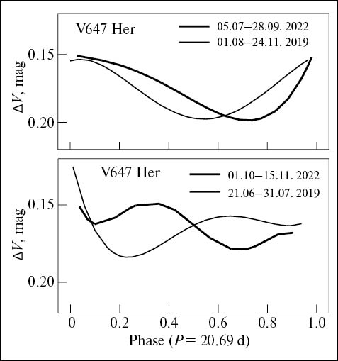 Изменения блеска и цвета V647 Her по крымским наблюдениям 2019 г. и 2022 г. и по данным 2004 г. из каталога SuperWASP происходят с периодом 20.69 сут, что позволяет считать это значение периодом вращения звезды. Фазовые кривые, построенные с этим периодом, представляют характеристики вращательной модуляции, которая наблюдается при неоднородном распределении пятен на поверхности звезды. Форма фазовой кривой, амплитуда и фаза минимума меняются, оставаясь стабильными в течение 40-100 дней (рис. 3в, рис. 5). Согласно фазам минимума, можно выделить два типа фазовых кривых: с одним минимумом, когда вращательная модуляция обусловлена появлением области повышенной концентрации пятен на одном из полушарии, и двумя минимумами, как было в октябре-ноябре 2022 г., когда такие области наблюдались на обеих полусферах. В табл. 3 приведены данные об амплитудах и фазах минимума на указанных интервалах.