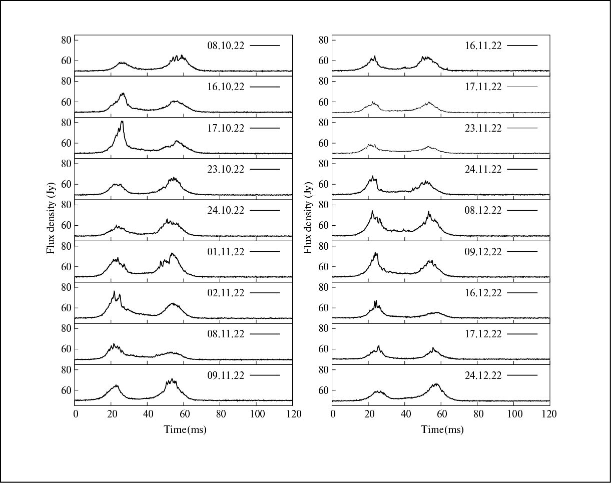 Мы использовали режим непрерывной регистрации недетектированного сигнала (напряжения) с 8-разрядной оцифровкой в течение 3.3 мин (168 импульсов). В момент времени, который соответствует моменту прихода первого импульса, начинается буферизация данных, поступающих с АЦП. Данные формируются блоками по 2048 точек. Затем эти блоки отправляются в оперативную память и непрерывно записываются на жесткий диск в течение заданного времени (3.3 минуты). Временно́й интервал между выборками (8-битные целые числа со знаком) составляет 0.2 мкс. За шесть месяцев с 8 октября 2022 г. по 24 марта 2023 г. было проведено 38 сеансов наблюдений; наблюдения проводились два раза в неделю в течение двух дней подряд.