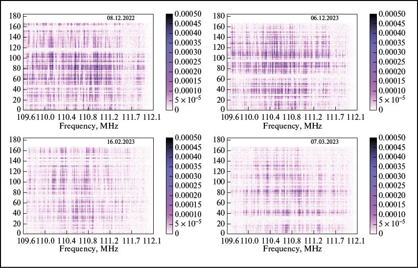 Мы построили динамические спектры (ДСП) для каждого сеанса наблюдений. На рис. 2 они показаны за 4 дня наблюдений. ДСП представляют собой изменение интенсивности по частоте и по времени, обусловленное прохождением излучения пульсара через неоднородности межзвездной плазмы. Хорошо видны яркие узкие детали по частоте и длинные в десятки периодов пульсара по времени. Светлые полосы по всему частотному диапазону соответствуют широкополосным уменьшениям амплитуды импульсов самого пульсара. Каждый динамический спектр S( fi,tj) является функцией частоты f и времени t и состоит из Nf ×Nt значений, где 1 ≤ i ≤ Nf и 1 ≤ j ≤ Nt, Nf — количество частотных каналов в полосе пропускания от 109.6 до 112.1 МГц, — количество отдельных спектров в данном сеансе наблюдений. Мы откалибровали динамические спектры следующим образом: