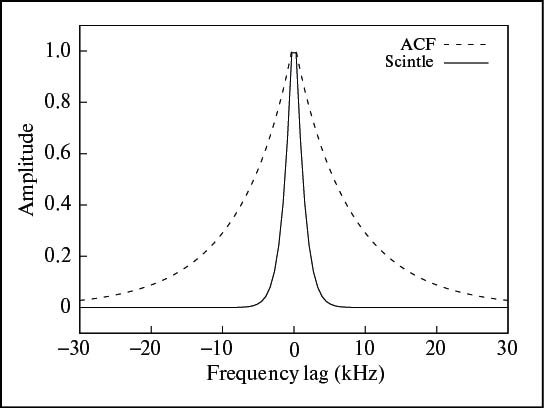 - Из анализа частотных сечений двумерной автокорреляционной функции следует, что истинный вид дифракционных искажений в среднем может быть представлен обобщенной экспоненциальной функцией с полосой 1.2 кГц и показателем 0.57 (рис. 9). Такую форму частотных сцинтилей формально можно интерпретировать как действие резонансного фильтра с очень высокой добротностью.
