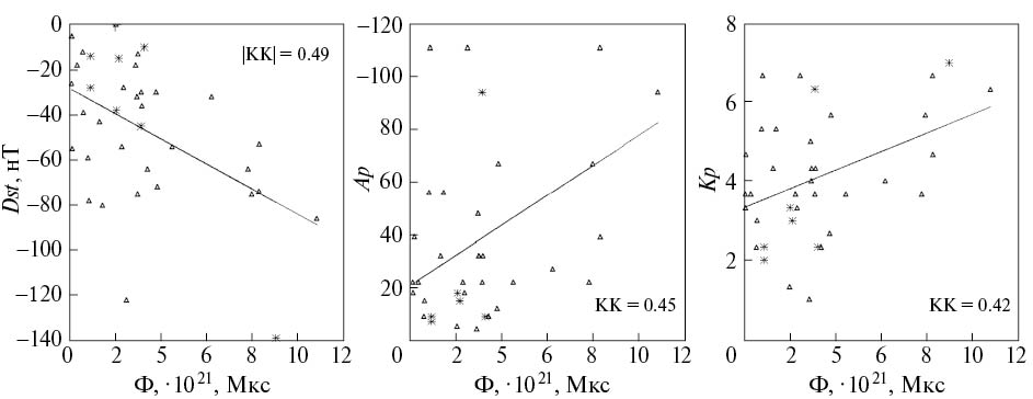 В работах [25–27] рассматривалась выборка из 50 эруптивных событий за 1997–2006 гг., приведших к геомагнитным бурям с Dst < –100 нТ. На основе этой выборки были построены зависимости между индексами геомагнитной активности (DstAp) и величиной суммарного магнитного потока из областей диммингов и постэруптивных аркад. В результате проверки полученных соотношений авторы получили, что между расчетом и измерением КК ≈ 0.5–0.7 для Dst и КК ≈ 0.7–0.9 для Ap.