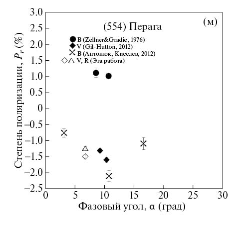 В работе [23] была найдена большая положительная поляризация излучения астероида (554) Перага (Pr = 1%) на фазовых углах 8—10°. Зельнер и Градье [23] отметили этот уникальный случай среди большого числа объектов, которые они наблюдали. Они исключили ошибку в отождествлении объекта, так как он двигался в поле звезд в обе даты наблюдений в соответствии с эфемеридой. Так как на зависимости Pr (a) было всего две точки, можно было заподозрить, что переход ФЗП астероида от отрицательных значений Pr к положительным происходит на очень небольшом угле инверсии αinv < 8°. Как отмечалось выше, обычно в диапазоне фазовых углов 0 – αinv фазовая зависимость степени поляризации большинства астероидов имеет один минимум [24] и хорошо описывается тригонометрическим полиномом [25] или параболой. В настоящее время установлено, что минимальный угол инверсии составляет около 14° для астероидов F-типа, а максимальный угол инверсии равен около 28° для “Barbara-like” астероидов S-типа [26]. Отметим, что пока абсолютный минимум угла инверсии безатмосферных тел Солнечной системы принадлежит спутнику Юпитера Европа (αinv ≈ 6.1°, полоса V ) [13].