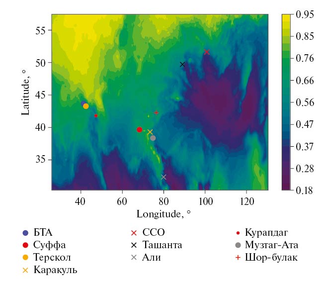На основе анализа пространственных распределений осажденного водяного пара и доли общей облачности, усредненных для ночного времени за период с 2013 по 2022 г., выявлены оптимальные пространственные области с высокими астроклиматическими показателями. Показано, что области с пониженным содержанием водяного пара в тропосфере — нижней стратосфере, вытянутые преимущественно в меридиональном направлении, и низкой долей покрытия общей облачностью включают в себя места расположения Саянской Солнечной обсерватории (пик Хулугайша) и АПП Ташанта. На Северном Кавказе высокие астроклиматические показатели демонстрируют пункты горного Дагестана (в качестве референсных пунктов нами выбраны г. Курапдаг, г. Хорай и вершины плато Гуниб). Одни из лучших астроклиматических показателей демонстрируют астропункты, находящиеся в обширной области пониженных значений PWV, соответствующие темно-синему цвету на рис. 4. Наилучшие астроклиматические условия в терминах TCC и PWV наблюдаются над астропунктом Али на плато Тибет в Китае. В пределах этой обширной области следует отметить такие пункты с высокими астроклиматическими показателями, как Музтаг-Ата, озеро Каракуль и Шор-Булак.