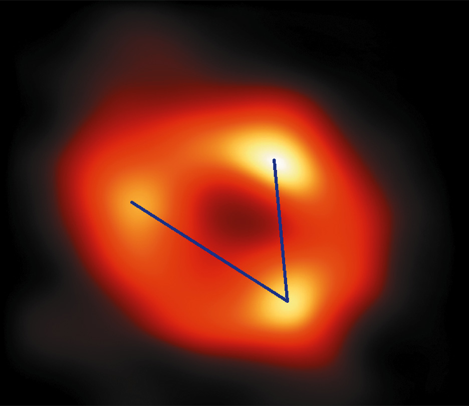 Рис. 3. Образ СМЧД в Cтрельце A*, наблюдаемый ТГС [1]. Прямые линии соединяют положение вспышек в диске и в первом и во втором фотонном кольце, образуя угол, который зависит только от спина черной дыры