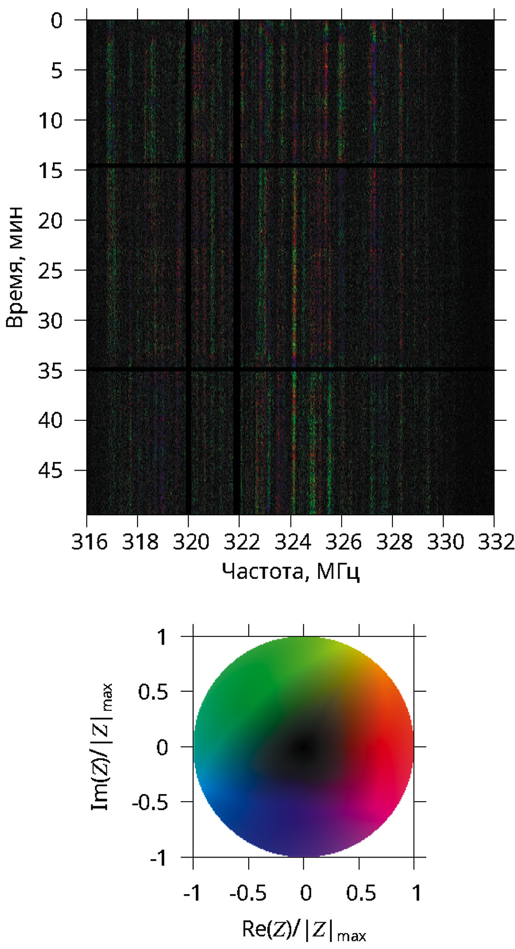 Рис. 1. Верхний график — наблюдаемый динамический кросс-спектр на базе RA-AR. Для каждой точки кросс-спектра усредненное комплексное значение Z(a)(f,t) отображается в точку единичного цветового круга так, как это проиллюстрировано на нижнем графике, |Z(a)|max — максимальное значение модуля кросс-спектра
