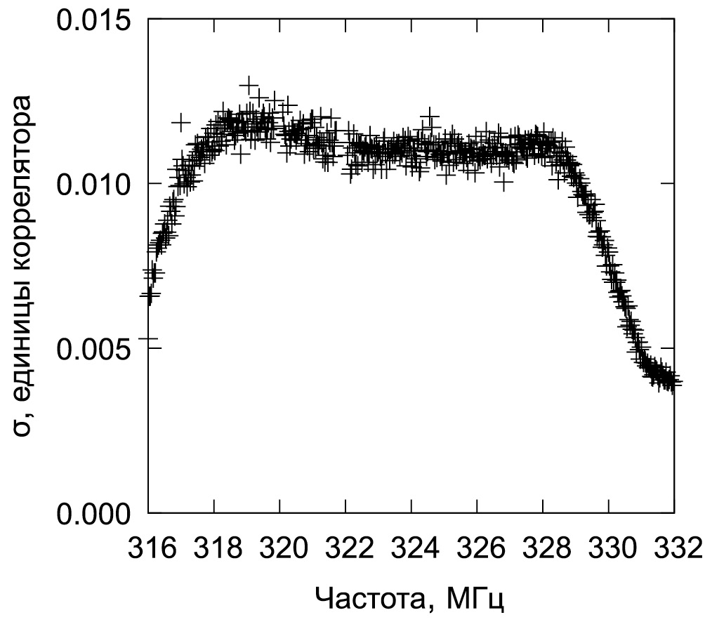 Для оценки ошибок, вносимых шумами системы, описанный выше алгоритм предварительного усреднения был применен к динамическому кросс-спектру, полученному при корреляции сигнала вне импульса пульсара. Статистический анализ полученного таким образом шумового кросс-спектра системы показал, что его действительная и мнимая части, как и следовало ожидать при нормальном функционировании аппаратуры, являются независимыми нормально распределенными случайными величинами. Среднеквадратичное отклонение этих случайных величин, обозначенное ниже как σ(t, f), не зависит от времени t, но заметно меняется с частотой f (см. рис. 2).