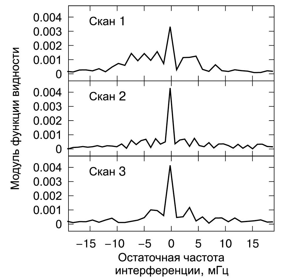 На рис. 4 показаны сечения модуля функции видности по fres при Δt = 0 для трех наблюдательных сканов. Видно, что в первом скане, в котором значение r более чем в два раза превосходит значения для двух других сканов, максимум несколько шире и ниже. Сравнение амплитуд функции видности для трех сканов обнаруживает различие в пределах 10%.
