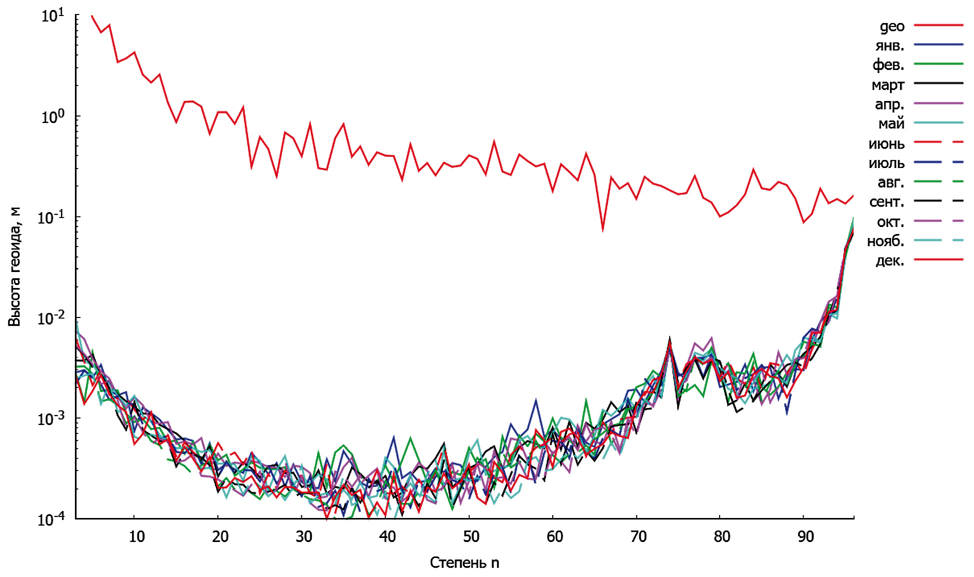 Дисперсии степенных разностей восстановленного поля и эталонных моделей демонстрируют характерное поведение ошибок коэффициентов сферических гармоник: сначала они уменьшаются, достигая минимального значения в низкочастотной и начале среднечастотной частей спектра, затем они возрастают, достигая соответствующих значений гравитационного сигнала (кривая «geo») (см., напр., [38]). Минимальных значений высот геоида (≈ 0.1 мм) эти разности достигают для степеней n = 20–60. Формально разложение имеет смысл, пока величина ошибки сферической гармоники не станет равной значению самой сферической гармоники. В данном случае это происходит при n = 160. Таким же образом меняется поведение дисперсий степенных разностей эталонных моделей в сравнении комбинированной моделью XGM2019e (кривые Grace2010s vs XGM2019e и Grace2018s vs XGM2019e). В целом изменение дисперсий степенных разностей восстановленного поля и эталонных моделей соответствует кривой Grace2010s vs XGM2019e, что говорит об адекватном восстановлении ГПЗ на длительных временных интервалах с использованием разработанного ПК.