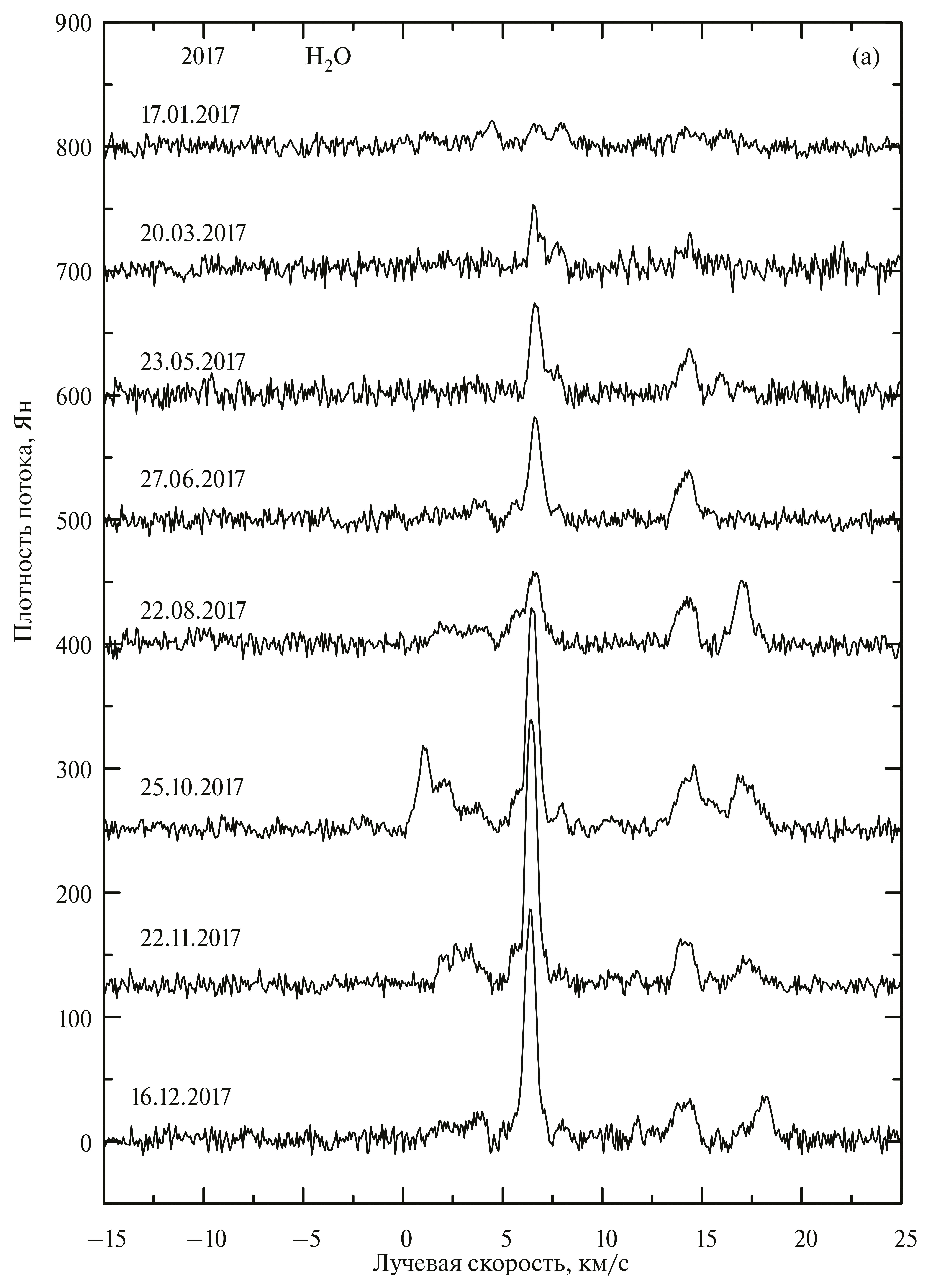 Настоящая работа посвящена исследованию вспышек в период 2017–2023 гг. Полный каталог спектров и результаты их анализа будут опубликованы в нашей последующей работе по S255 IR. Временной интервал 2017–2023 гг. в настоящей работе был выбран по двум причинам. Во-первых, в какой-то степени наши исследования являются ответом на поставленные в [14] вопросы (например, причина отсутствия внезапного и сильного увеличения интенсивности мазера H2O после вспышки аккреции в 2015 г.). Во-вторых, в этот период имел место существенный рост интегрального потока и происходили самые сильные вспышки мазерного излучения водяного пара за все время нашего мониторинга этого источника. Мы не приводим здесь данные нашего мониторинга за 2015–2016 гг., потому что спектры за этот период были опубликованы в работе Хирото и др. [14]. В анонсируемой работе все спектры будут приведены.