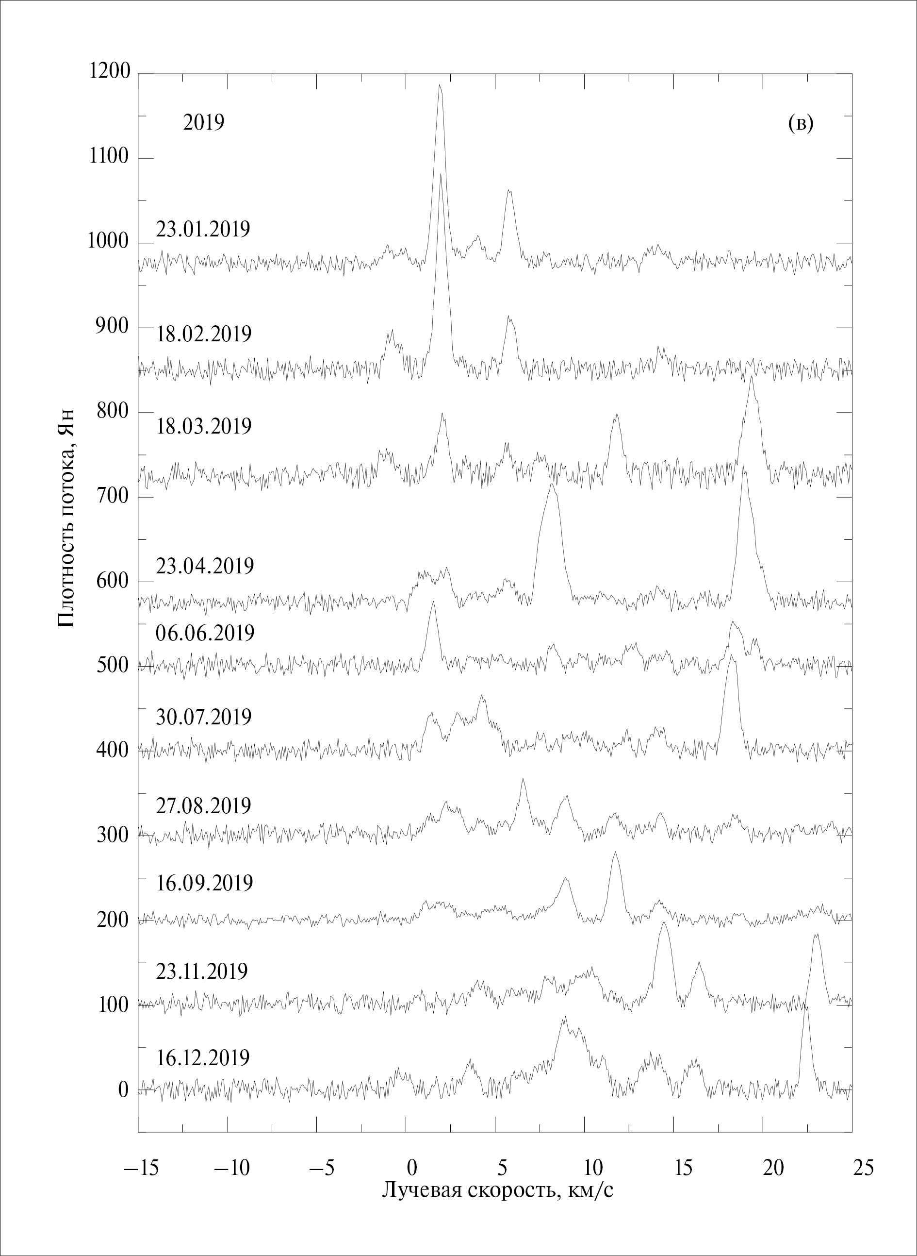 Регистрация сигнала осуществлялась 2048-канальным автокорреляционным приемником с разрешением 0.0822 км/с по лучевой скорости. Точность определения лучевой скорости находилась в пределах 20–25 м/с. Интервалы между сеансами наблюдений составляли в основном около одного месяца. Однако, когда происходили сильные вспышки, то в пределах одного сеанса (3–4 дня) мы проводили несколько наблюдений.