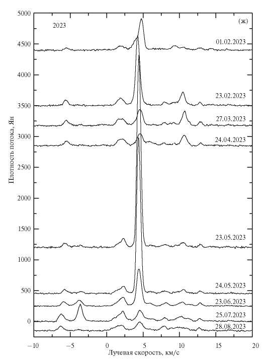Но в дальнейшем в области этой лучевой скорости спектр был достаточно сложным. С начала 2023 г. наблюдалась серия трех последовательных сильных вспышек (см. рис. 7 и 16). Первая имела скорость 4.76 км/с и плотность потока 510 Ян. Вторая кратковременная вспышка произошла на скорости 4.3 км/с с плотностью потока в максимуме около 1000 Ян. Третья вспышка имела скорость 4.6 км/с, максимальная плотность потока достигала 3100 Ян и вспышка имела большую продолжительность, чем вторая вспышка.