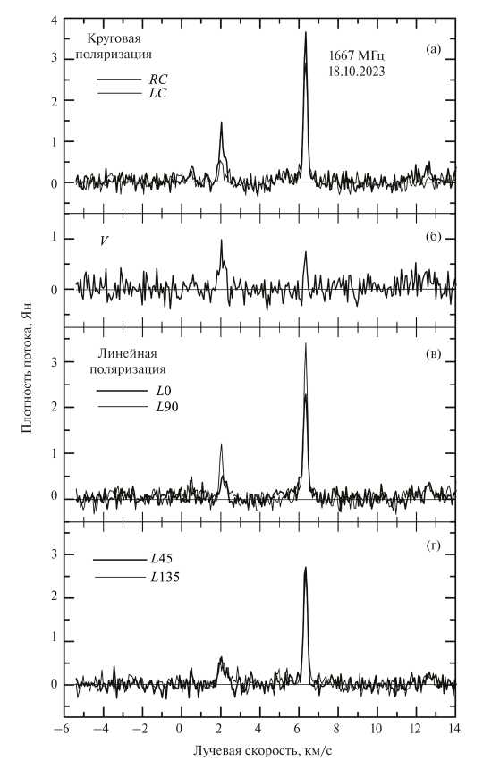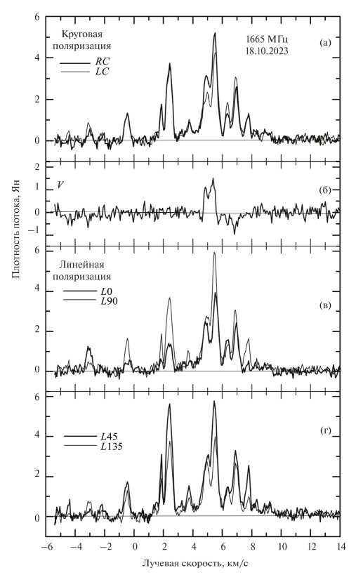 Излучение в линии гидроксила в S255 IR по наблюдениям в 2008 г. не было обнаружено с верхним пределом около 0.1 Ян. Результаты наблюдений OH в 2015, 2023 и 2024 гг. в главных линиях 1665 и 1667 МГц представлены на рис. 10–12 и 13–15 соответственно. На верхних панелях (а) показаны спектры в круговых поляризациях. На панелях (б) представлен параметр Стокса V, определяемый как разность излучения в правой и левой круговых поляризациях. При регистрации линейной поляризации сначала принимается сигнал из двух ортогональных направлений 0° и 90° (панели в), а затем после поворота облучателя антенны на 45° из направлений 45° и 135° (панели г).
