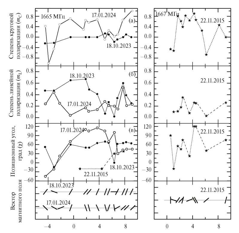 На панелях (г) рис. 17 отрезками прямых линий нанесены векторы поперечного магнитного поля для отдельных мазерных деталей в различные эпохи наблюдений. Имеются два преимущественного направления поперечного магнитного поля: ∼±30° относительно вертикали. В линии 1665 МГц в 2023 г. преобладало одно направление магнитного поля, ∼+30°, а в 2024 г. оба направления были более или менее равнозначными. Несмотря на сохранение структуры спектра в линии 1665 МГц, в некоторых деталях за короткое время (не более трех месяцев) произошли существенные изменения направления вектора поперечного магнитного поля на угол около 60°–70°.