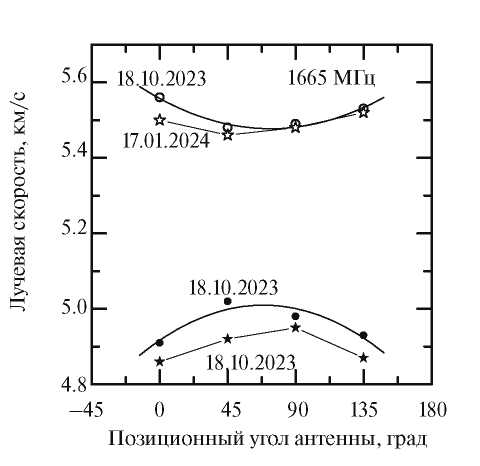 Для двух главных деталей в линии 1665 МГц на их средних лучевых скоростях 4.95 и 5.0 км/с имеется зависимость лучевой скорости от позиционного угла антенны (рис. 18). Изменение скорости деталей происходило в противофазе. Наименьшее расстояние между деталями наблюдалось при позиционном угле антенны . Такая картина наблюдалась для двух эпох 2023 и 2024 гг., что не может быть случайностью. Обращаем внимание на то, что в круговых поляризациях проявляется сложная структура каждой из этих спектральных деталей. Таким образом, можно предположить, что наблюдаемое явление связано с неоднородной структурой мазерных конденсаций, либо с компактным скоплением конденсаций с достаточно близкими лучевыми скоростями. По этой причине наблюдаемый сдвиг максимумов спектров между круговыми поляризациями не является следствием зеемановского расщепления линии.