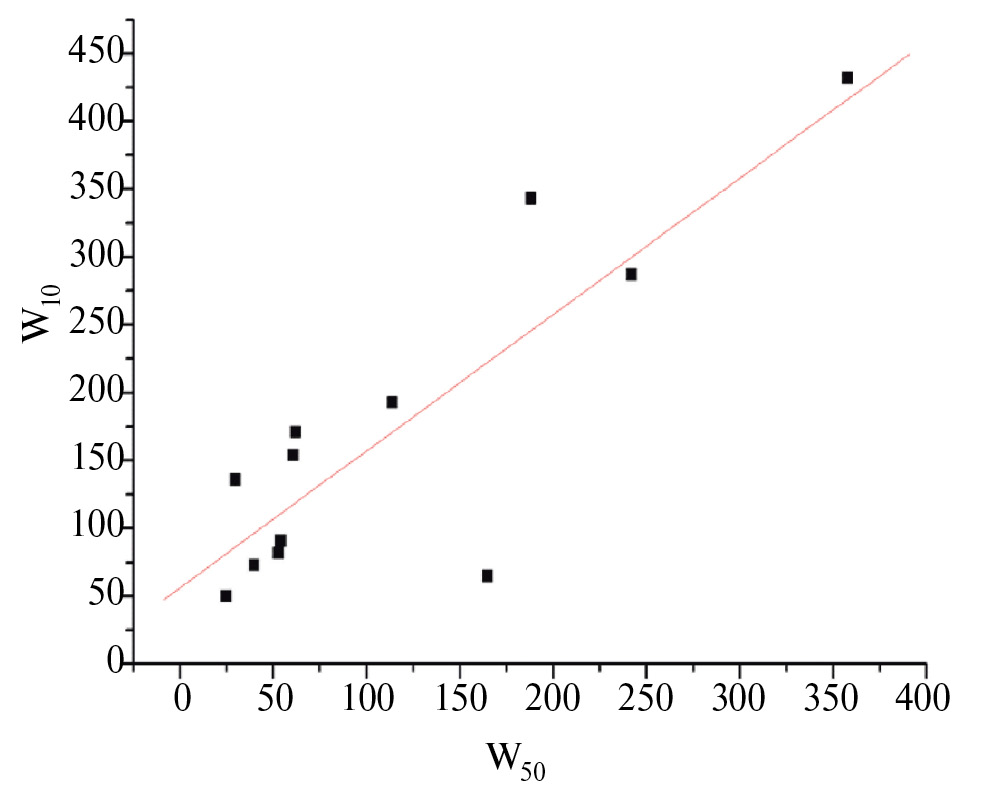 Если использовать зависимость между W10 и W50 (см. рис. 3)