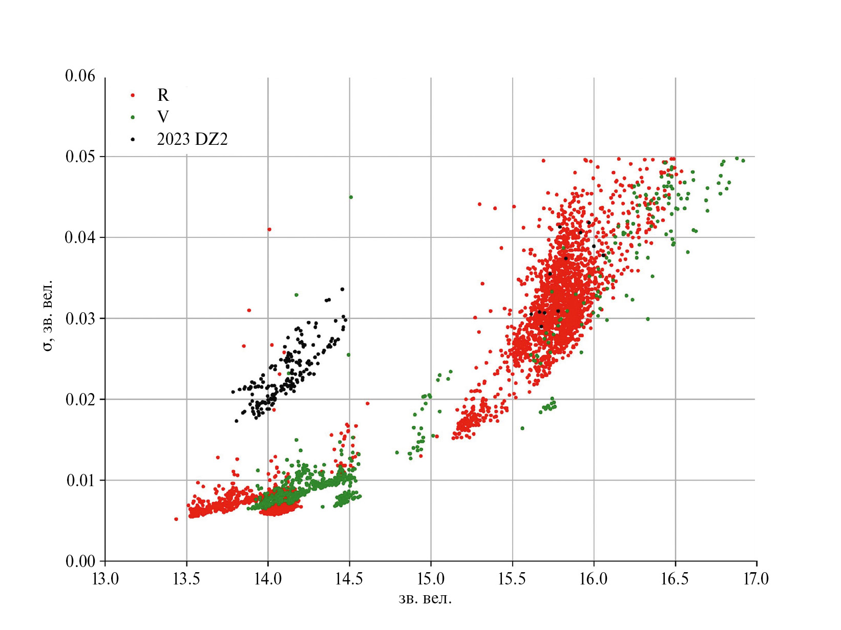 Первоначальная обработка фотометрических наблюдений выполнялась с помощью программы AM:PM, разработанной в Коуровской астрономической обсерватории УрФУ [4]. Зависимость ошибок определения блеска рассматриваемых в настоящей статье АСЗ на телескопе СБГ от видимой звездной величины в фильтрах V и R представлена на рис. 1. Обычно фотометрические наблюдения на телескопе СБГ проводятся для объектов ярче 16.5m–17.0m, что обеспечивает точность определения звездной величины не хуже 0.05m. Черными точками на рис. 1 показаны стандартные отклонения для фотометрических наблюдений в фильтре R астероида 2023 DZ2, который прошел 25.03.2023 на минимальном геоцентрическом расстоянии около 175 000 км. Точность наблюдений, выполненных 23.03.2023 (блеск астероида около 15.5m–16.0m), соответствует точности фотометрических наблюдений других астероидов. На следующий день 24.03.2023, накануне максимального сближения с Землей, астероид имел высокую скорость видимого движения относительно звезд (более 30ʺ/мин), что привело к росту ошибок фотометрических наблюдений примерно на 0.01m, несмотря на увеличение блеска астероида до 13.7m–14.5m.