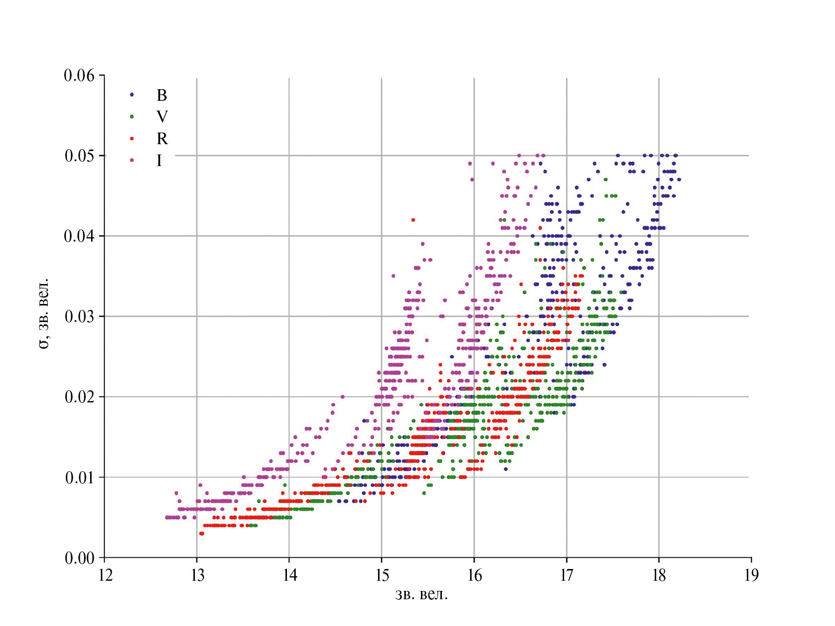 На рис. 2 приведены ошибки фотометрии АСЗ, наблюдавшихся на телескопе Цейсс-1000 в фильтрах B, V, R, I, в зависимости от звездной величины. Дискретность приведенных на рис. 2 данных связана с тем, что оценки звездной величины были получены с точностью 0.001m. Ошибки фотометрических наблюдений АСЗ, имеющих блеск 17.0m–17.5m, на телескопе Цейсс-1000 в фильтрах R и V, как правило, не превышают 0.040m–0.045m.