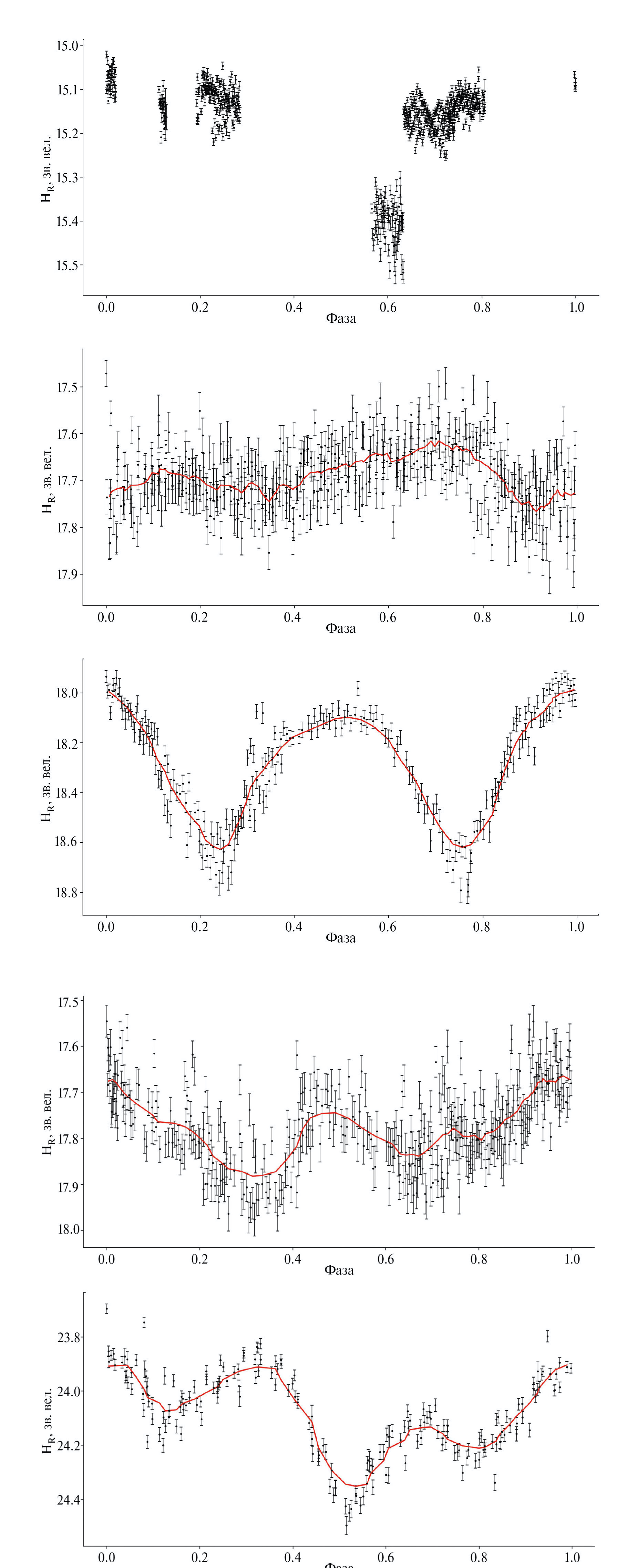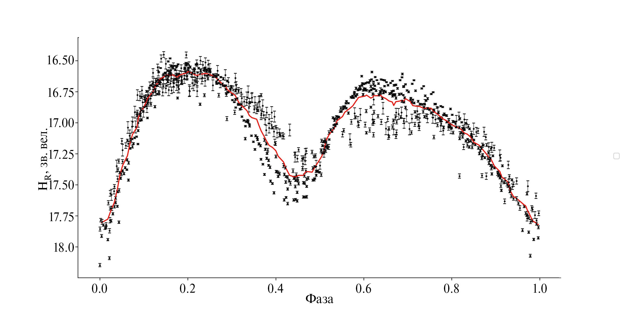 Рис. 5. Фазовая кривая блеска астероида (161 989) Cacus по наблюдениям на телескопах СБГ и Цейсс-1000. Красная линия — скользящее среднее.