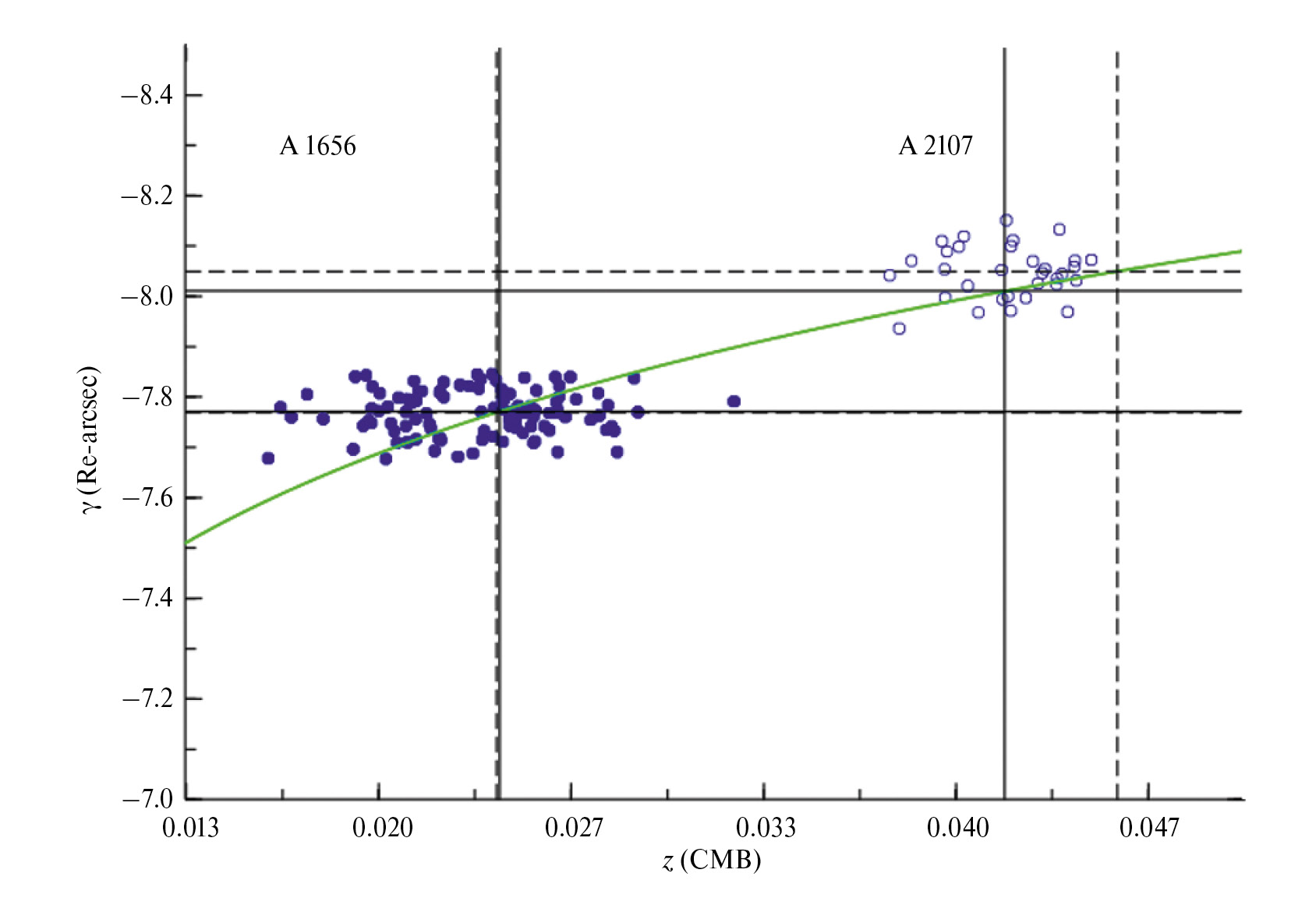 На рис. 2 методика определения пекулярных скоростей показана графически. На ней приведены наблюдаемые расстояния (нуль-пункты , рассчитанные для в угловых секундах) галактик в скоплении A 1656 (заполненные кружки) и в скоплении A 2107 (пустые кружки) в зависимости от их красных смещений относительно CMB. Жирной линией показана ожидаемая Хаббловская зависимость между расстоянием и красным смещением, рассчитанная для принятой нами модели , H 0 = 70 км · с –1 Мпк –1 , (эквивалентно параметру ) и нуль-пункта ФП, равного . Угловые расстояния галактик преобразованы в красные смещения с помощью аппроксимация Пибблса [32]: