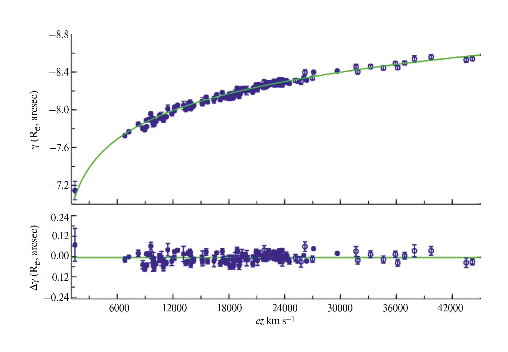 Рис. 3. Верхняя панель: зависимость угловых расстояний 140 групп и скоплений галактик, нуль-пунктов ФП , от лучевой скорости (диаграмма Хаббла), полученных с учетом эволюционного параметра [mag/arcsec 2 ]. Пустыми кружками показаны системы ( ), расположенные вокруг GV. Жирной линией показана ожидаемая зависимость Хаббла в Λ CDM космологической модели с . Нижняя панель: кривая остаточных отклонений.