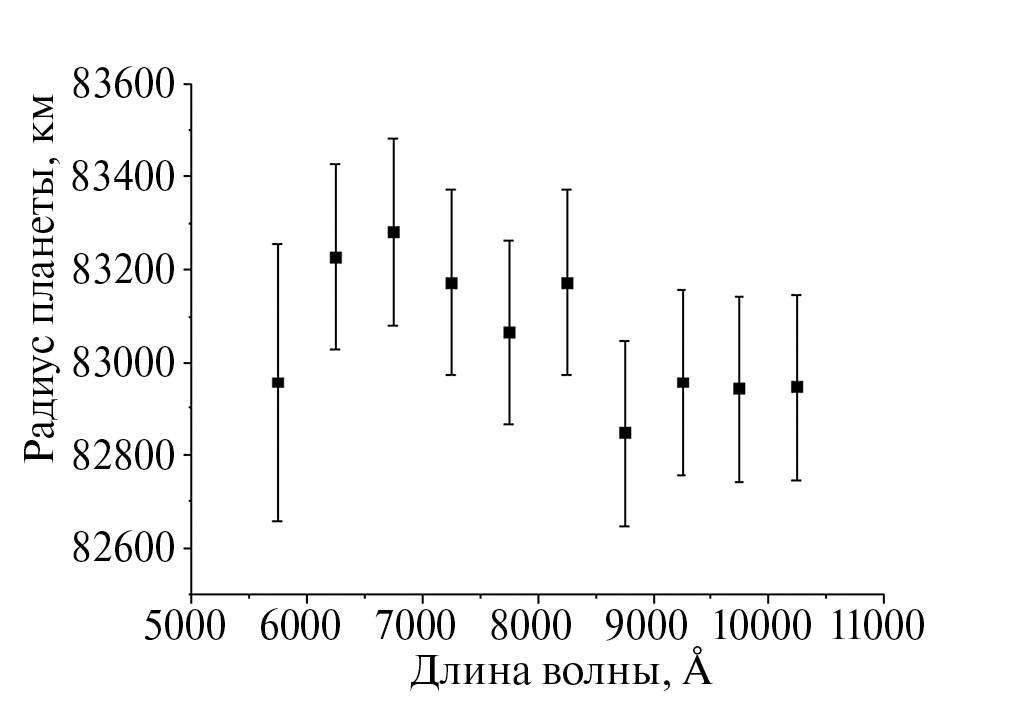 Еще одним результатом можно считать то, что в рассмотренной в данной работе модели характеристическая высота и радиус непрозрачной части планетарного диска были фиксированными для всех длин волн, в то время как коэффициент непрозрачности менялся от длины волны как λ4 , и при этом удалось получить эффективные радиусы планеты, а также их зависимость от длины волны, близкие к тем, что были получены из интерпретации наблюдательных данных (см. рис. 7–9). Это можно рассматривать как свидетельство возможности применения приблизительной модели рэлеевской атмосферы при определении характеристик атмосфер экзопланет из многоцветных фотометрических наблюдений.