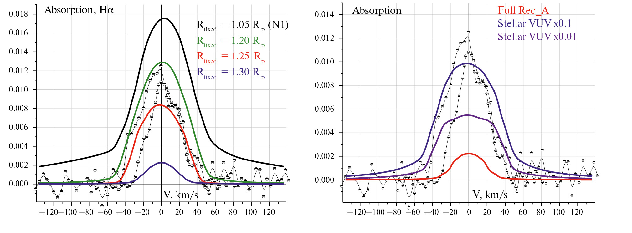 Рис. 4. Левая панель: профиль поглощения в линии Hα в середине транзита в единицах Доплеровской скорости, полученный в расчете с параметрами N1 (черная сплошная линия). Для сравнения показаны моделирования с различными радиусами и фиксированной температурой атмосферы: R fixed = 1.2 R p (зеленый), 1.25 R p (красный), 1.3 R p (синий). Здесь и далее открытыми кружками показаны измерения [9, 12]. Правая панель: поглощение в расчете без уменьшения рекомбинации типа А (красная линия), с уменьшенным в десять раз (синяя) и в сто раз (фиолетовая) звездным потоком излучения в VUV диапазоне. Все остальные параметры такие же как в расчете N1.